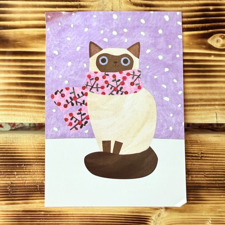Along with the items, this box also includes an info sheet—and guess what?! The custom artwork is back! After a few months of receiving a plain-colored content card, we’ve been graced once again with kitty art. This postcard was created by Angie Rozelaar and features the cutest Siamese kitty wrapped in a pink scarf. While it’s not technically an included item, I’ve really missed this feature and have loved seeing this pop of color on my fridge!