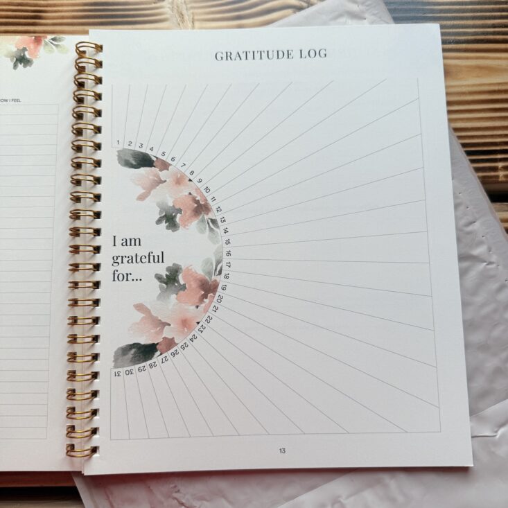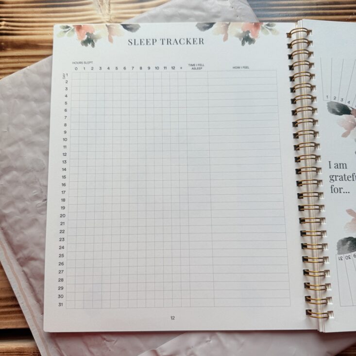 Page 12 features another tracker—this one for sleep. I don’t usually have trouble in that department, so I tend to skip it. The opposite page, though, is one of my favorites. Page 13 introduces the Gratitude Log, with a line for each day of January to jot down something I’m grateful for. I highly recommend this practice, even if you don’t use this specific planner. Especially during tough times, it’s such a gentle reminder of all the good things in life.