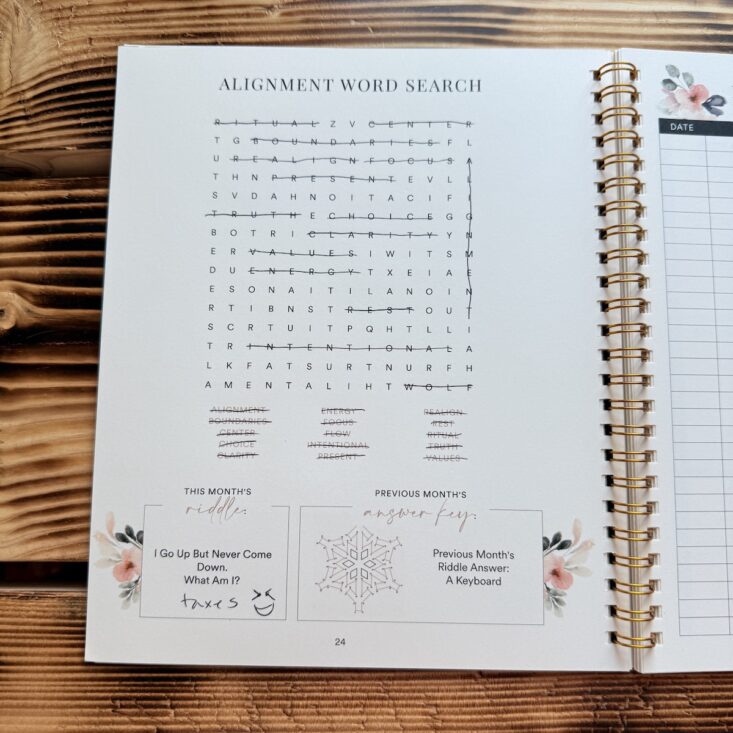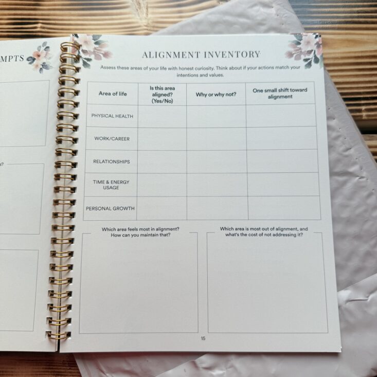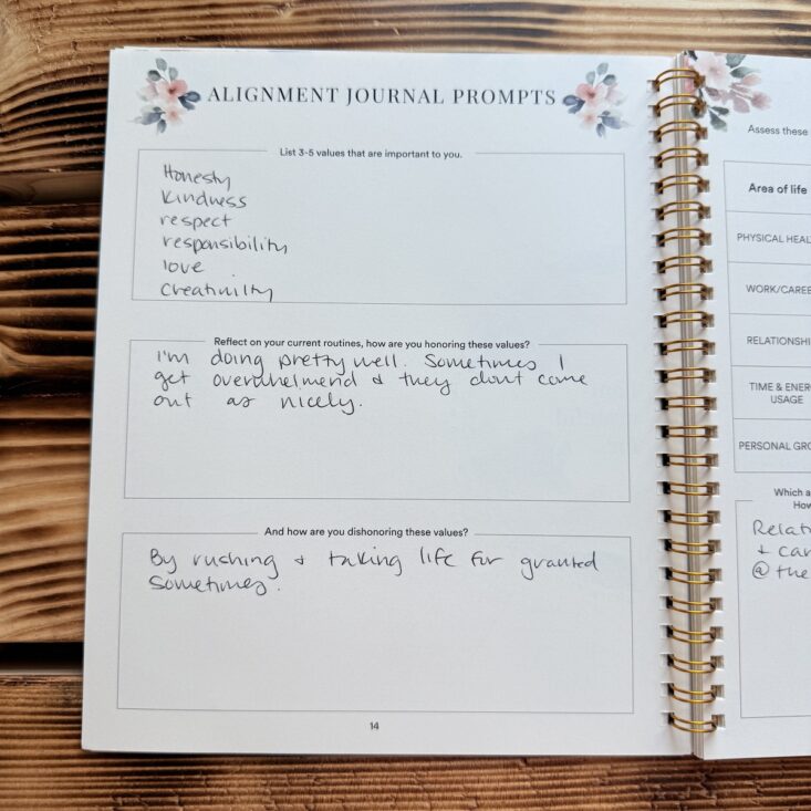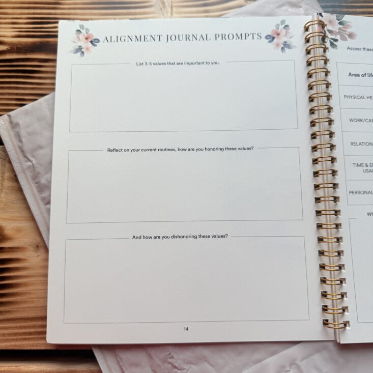 This month’s theme is Alignment, and the next few pages invite us to reflect on what that truly means in our own lives. On page 14, I jotted down the values that are important to me and reflected on my current routines—specifically how I am honoring or dishonoring those values. Page 15 offers space to assess different areas of my life with honest curiosity and see whether my actions align with my intentions and values.
