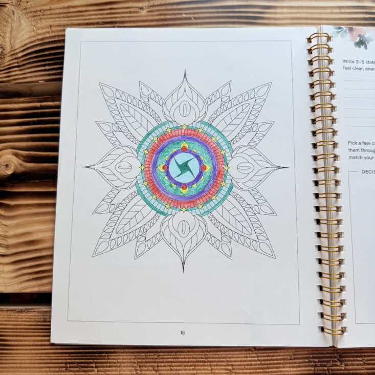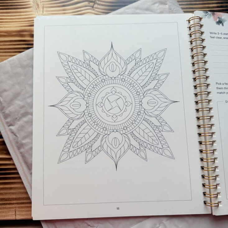 The next page features a really pretty coloring page that I actually had time to work on! Using my new colored pencils, it became a fun and relaxing activity that helped me unwind.