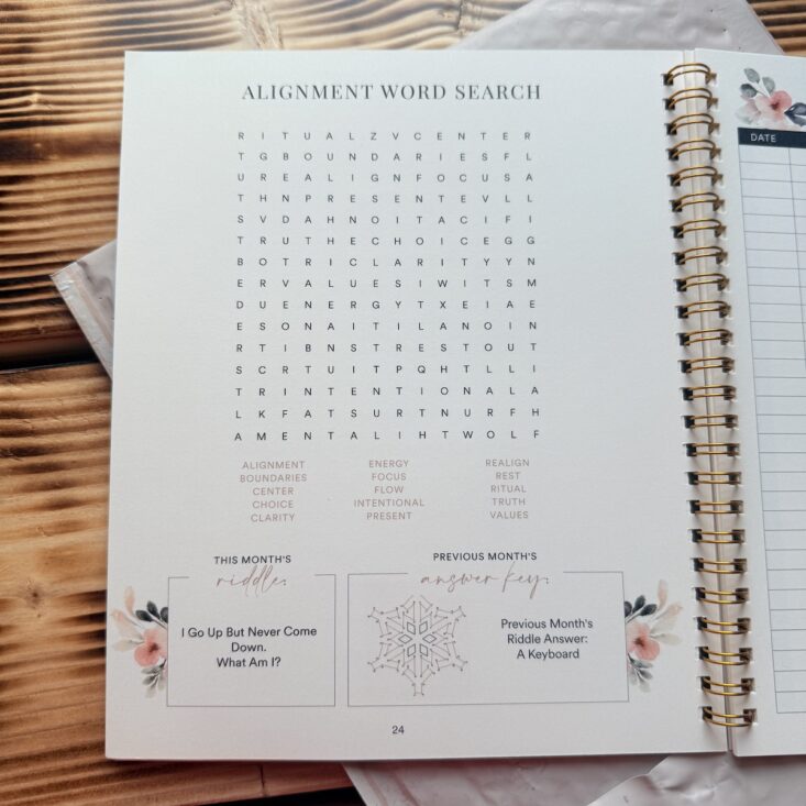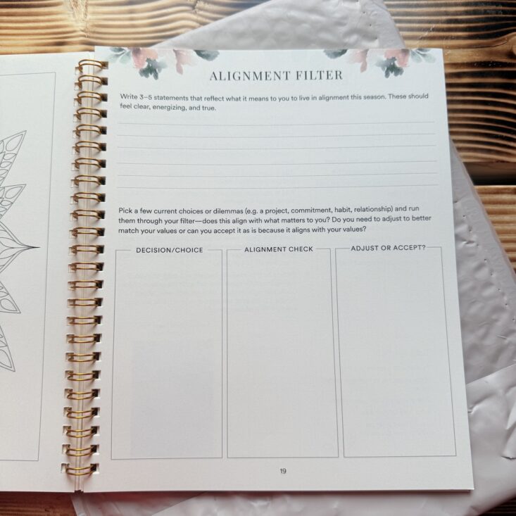 On the opposite page, we’re given an “Alignment Filter.” This page asks for three to five statements that reflect what it means to you to live in alignment during this season of life. It then encourages you to reflect on a few current dilemmas you’re facing. This prompt asked me to dig a little deeper than I had time for in the moment, so I plan to sit with it and save it for a quiet weekend.