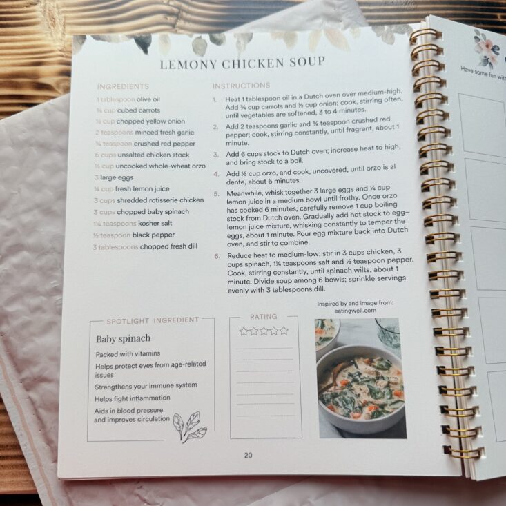 Every Silk + Sonder journal includes a recipe, and this month’s dish called for ingredients I didn’t have on hand—which is usually the case with these recipes! This month’s recipe is Lemony Chicken Soup, and while I love a good chicken soup, I’m not sure my family would appreciate the lemon twist. If you’ve tried it, let me know in the comments if it’s really worth giving a shot!