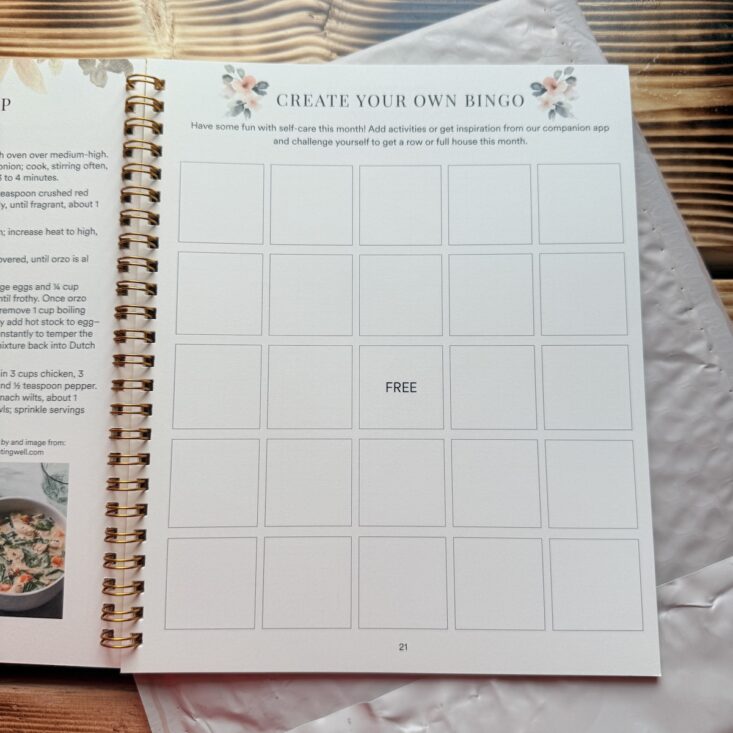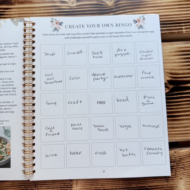 On the opposite page is a “Create Your Own Bingo” card, which is one of my very favorite activities. You add self-care tasks and try to get a bingo—how fun! It’s such a simple but motivating way to prioritize yourself.