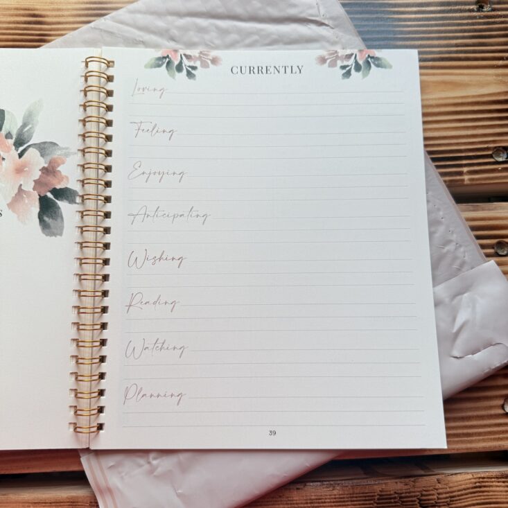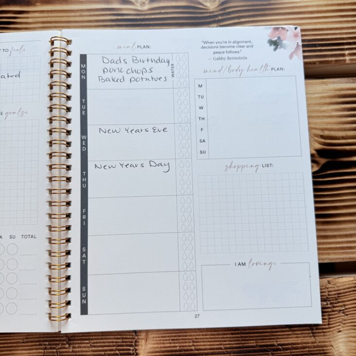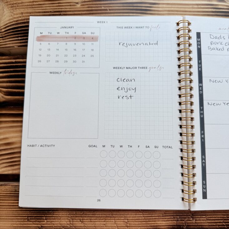 I love that this journal always starts on a Monday, even if that means beginning in the previous month. This month, started on Monday, December 29th so I got a jump start on the month! When it comes to the journal as a whole, I tend to spend most of my time on these calendar pages. With sections for meal plans, to-dos, habits and activities, shopping lists, and daily schedules, I write everything here. It keeps me on track each day and gives me that satisfying feeling of accomplishment—there’s truly nothing better than crossing an item off my list. I also appreciate the extra touches these pages include. While I don’t always fill out how I want to feel each week, this week I found it really helpful to write it down and pray over it. This journal is just so darn helpful!