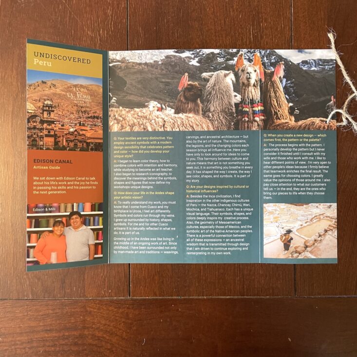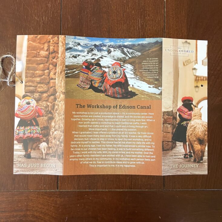 This quarter highlights Peru. The fold-out pamphlet includes an interview with one of the makers, Edison Canal. Edison's works aren't in every single box—since this subscription box offers the option to fully customize your selections, you may or may not end up choosing one of his alpaca wool creations. But if you go the route of a surprise curation, you may find his beautiful fingerless gloves keeping you warm this winter.