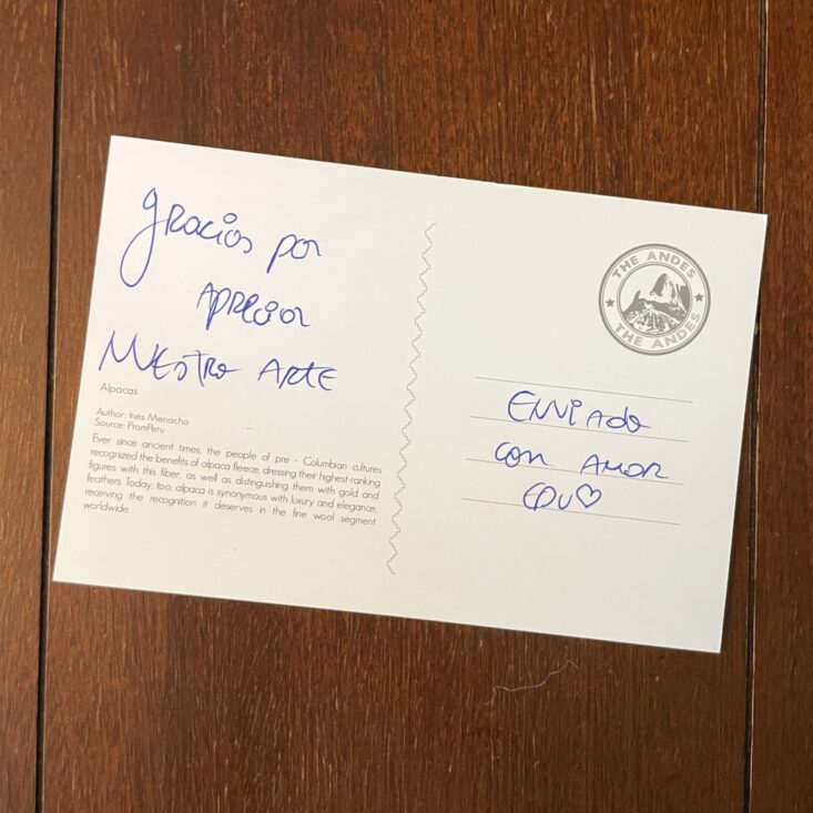 The box came with a handwritten postcard from the Peruvian neighbor who packed the box. I love this personal touch!