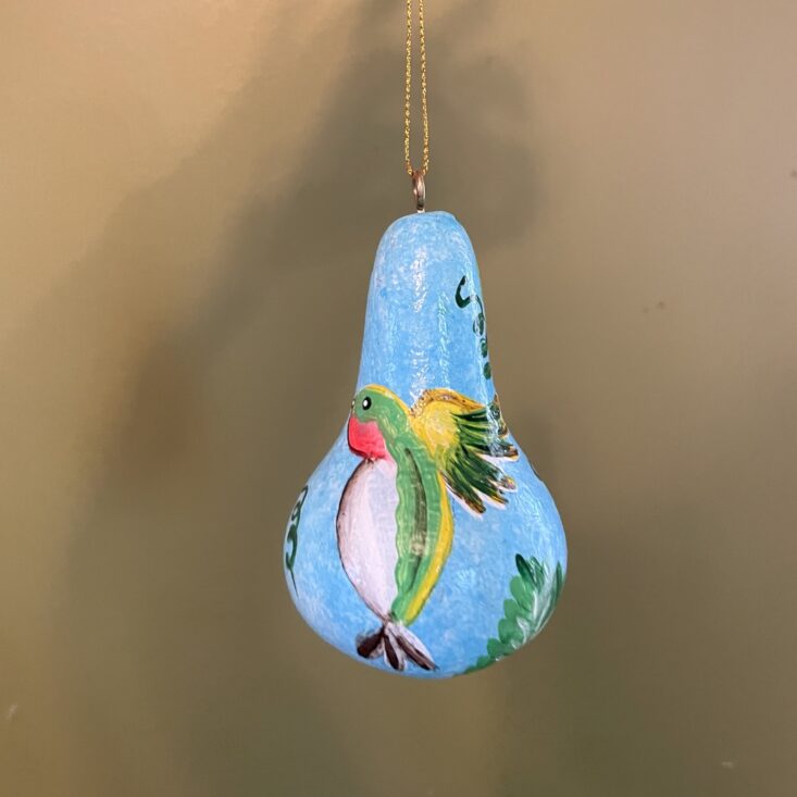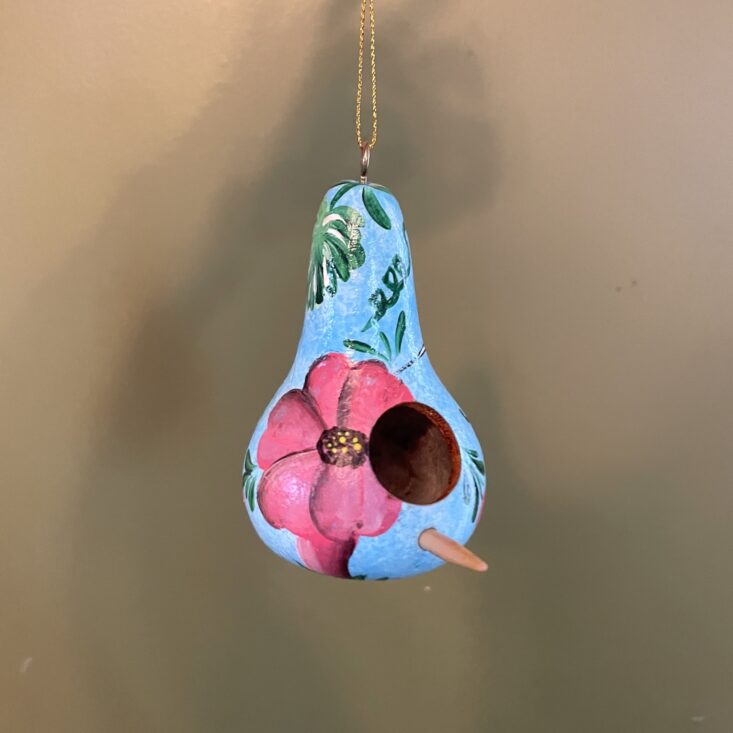 This petite birdhouse is made from a hollowed gourd. It's lightweight and painted so sweetly! Nothing beats repurposing nature's gifts, especially to help critters. This birdhouse is small and light enough to hang on our Christmas tree until springtime.