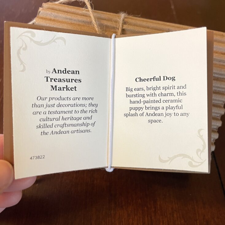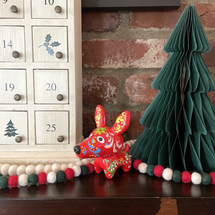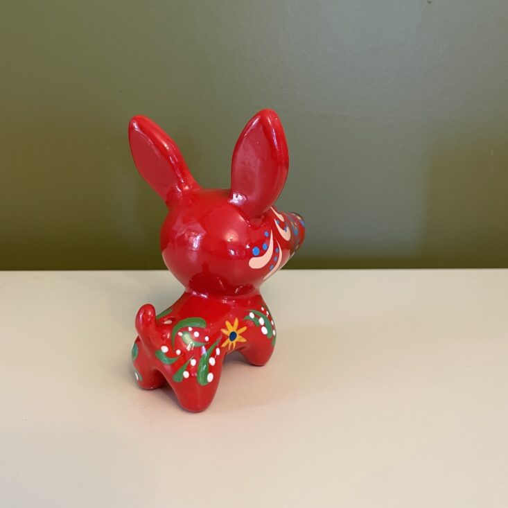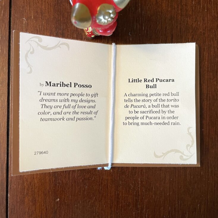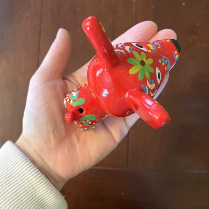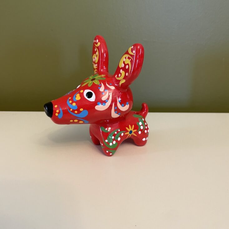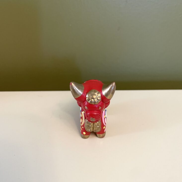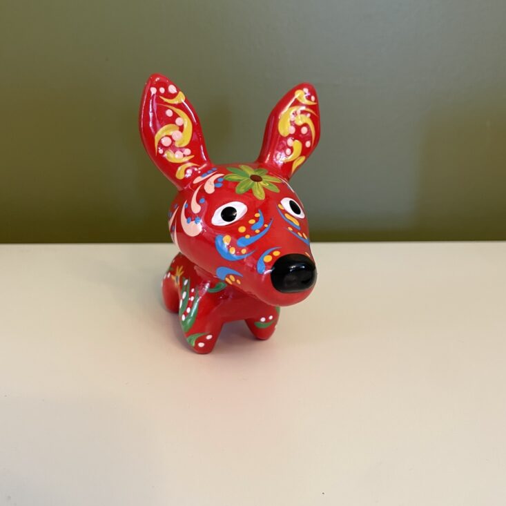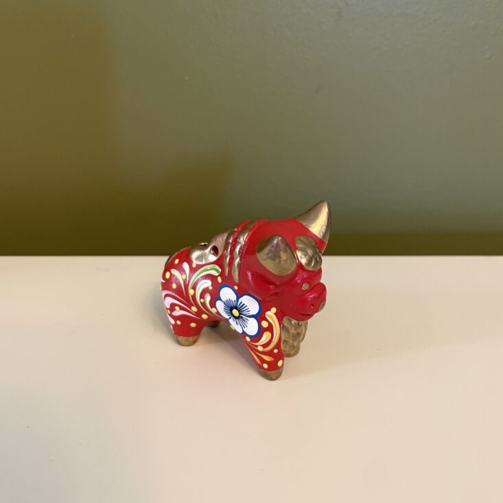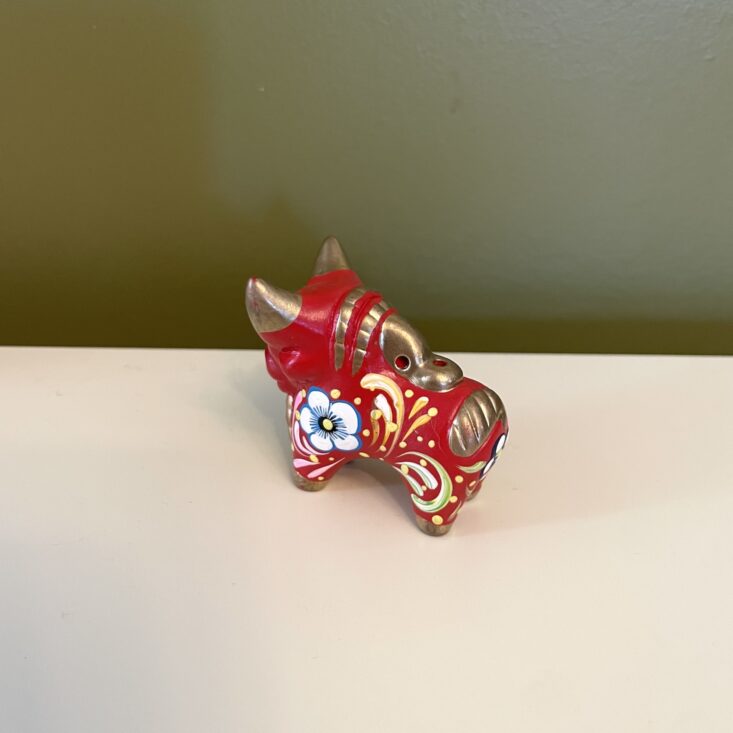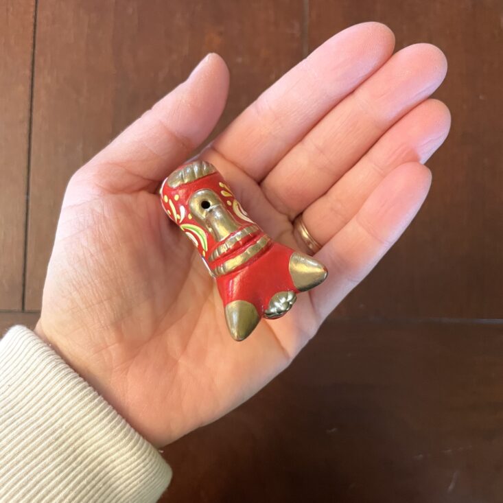 The details on this small bull are incredible! While in ways it's similar to the painted dog, the bull has a different spirit to it—it's more serene and even serious. It has high impact for such a little trinket. As is my theme with this box, I'm considering putting a string through its back and hanging it on my tree, but it can also be set on any surface and it would bring such eye-catching color to that corner of your home.