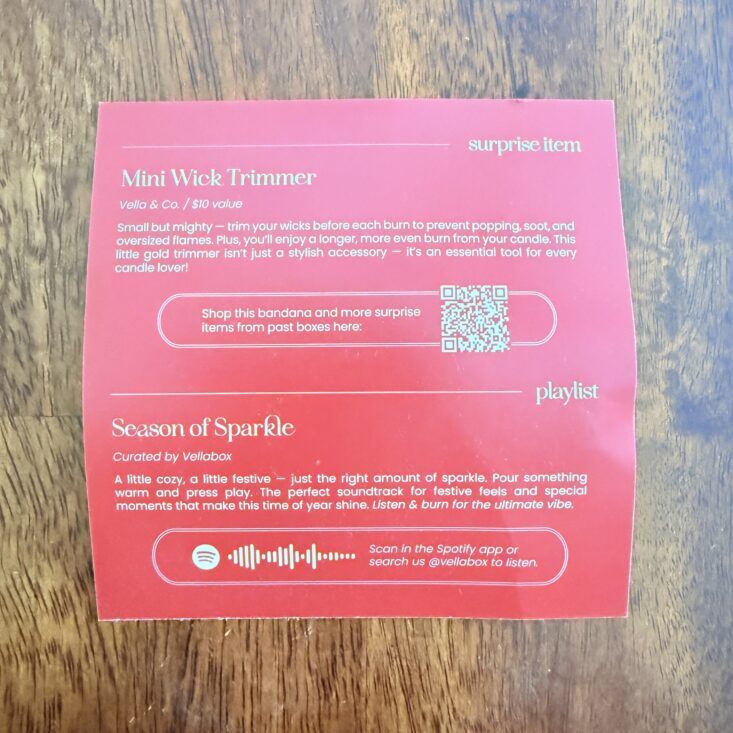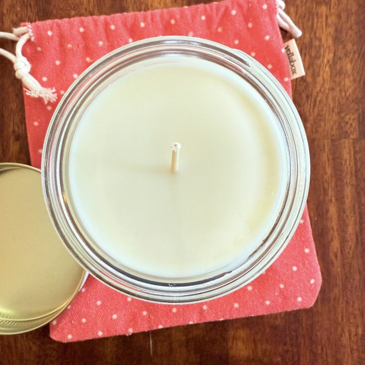 Minimalist in design, the clear glass jar and lovely red-font label coordinate beautifully with my Christmas décor and perfectly reflect Vellabox’s mission. I’m absolutely loving this month’s selection and have already burned it for hours!