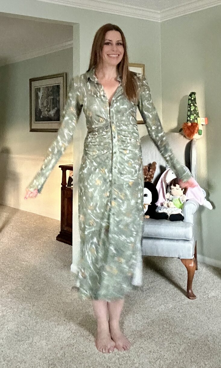 Size and fit: Cut from a slim-fitting viscose jersey, this artful frock showcases a vibrant flock of birds and a beautifully sculpted silhouette. It features a spread collar, long sleeves with elongated cuffs, a button-front closure, flattering ruching along the front and back, and a side-slit hem that adds just the right amount of flappability, or something. It was a little snug in the bust, but otherwise the fit was pretty fly.