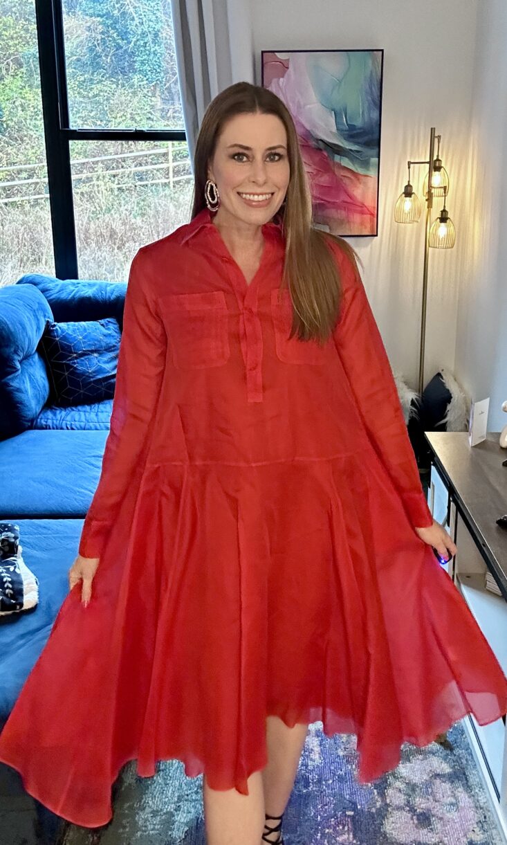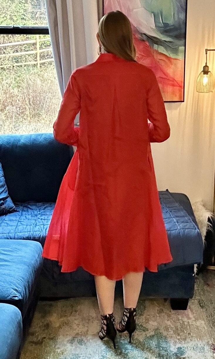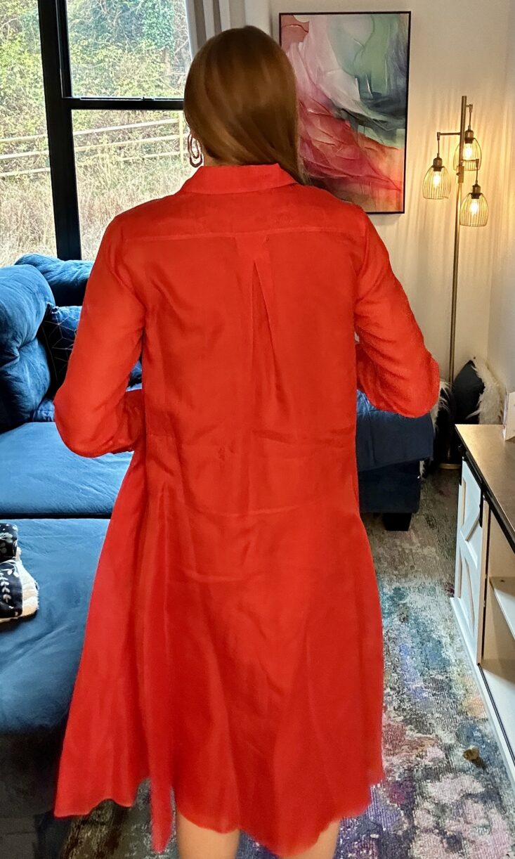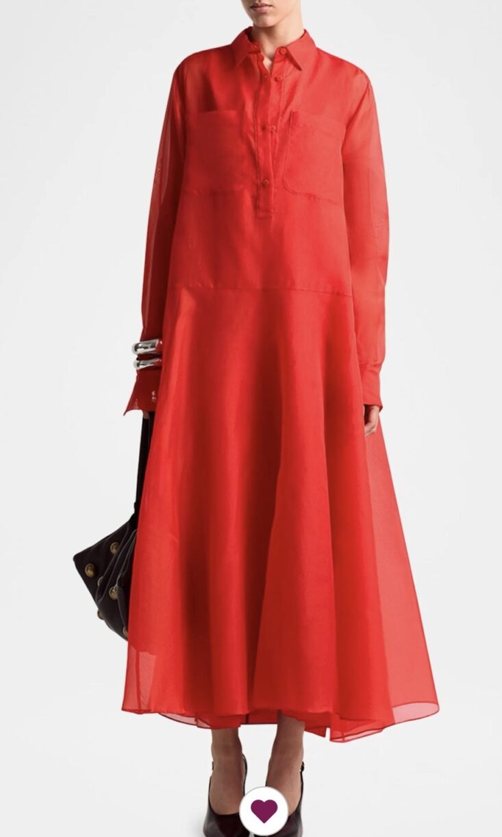 Size & Fit: Showcasing Altuzarra’s self-described “sense of childlike exploration,” this dress is a playful, theatrical twist on a classic shirt silhouette. Crafted from red silk-organza, it’s designed for a loose, airy fit with a defined waist and a dramatically voluminous hem that seems to float. The slip lining helps tame the sheerness, though it doesn’t do much to rein in the overall costume energy.