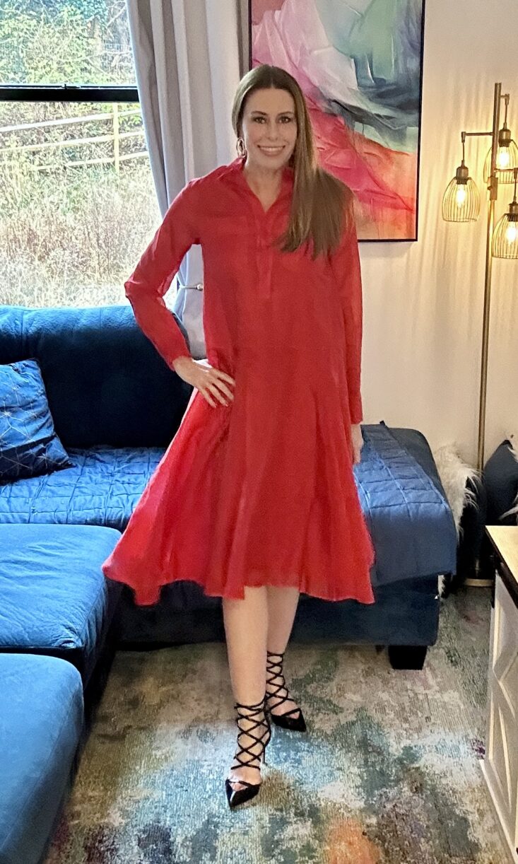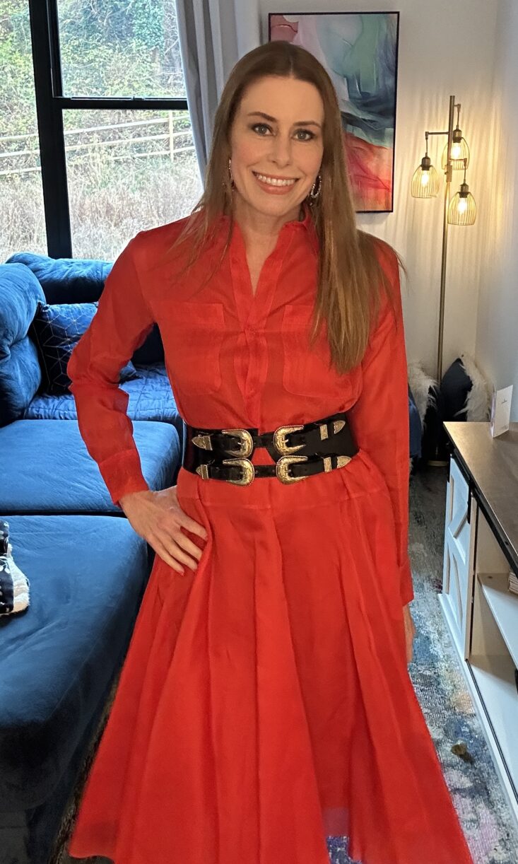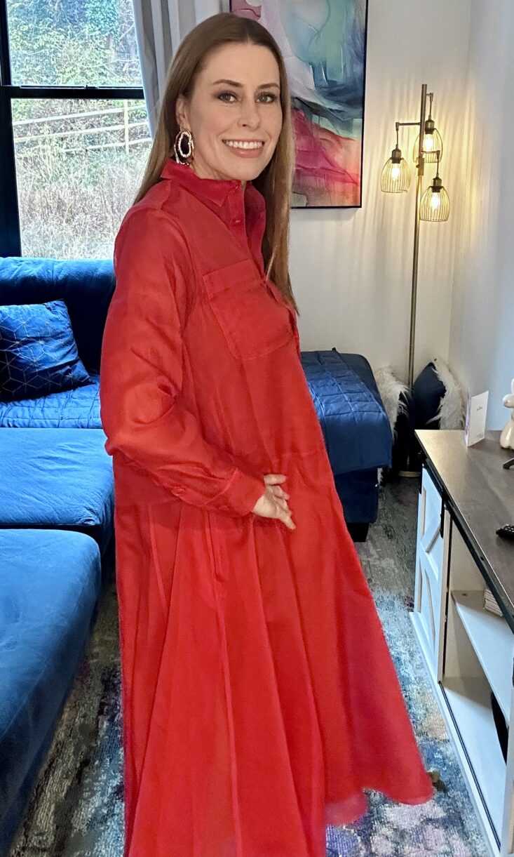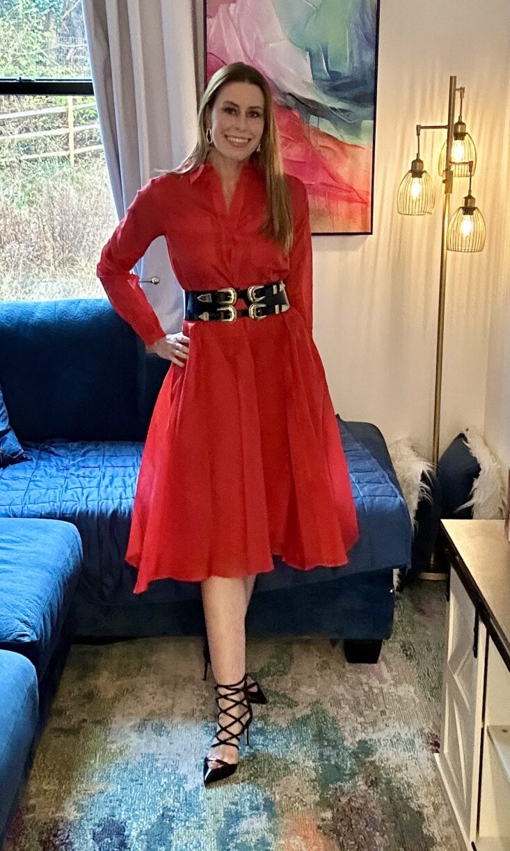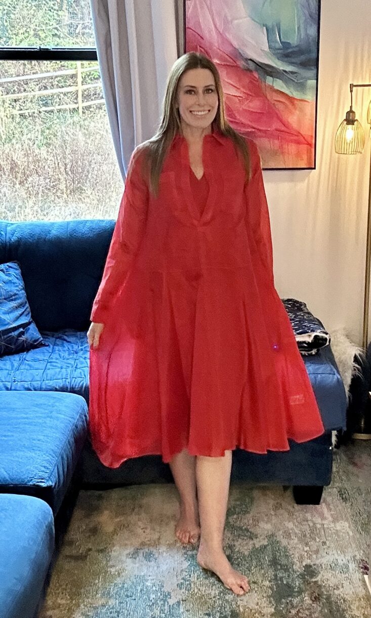 Size & Fit: Showcasing Altuzarra’s self-described “sense of childlike exploration,” this dress is a playful, theatrical twist on a classic shirt silhouette. Crafted from red silk-organza, it’s designed for a loose, airy fit with a defined waist and a dramatically voluminous hem that seems to float. The slip lining helps tame the sheerness, though it doesn’t do much to rein in the overall costume energy.