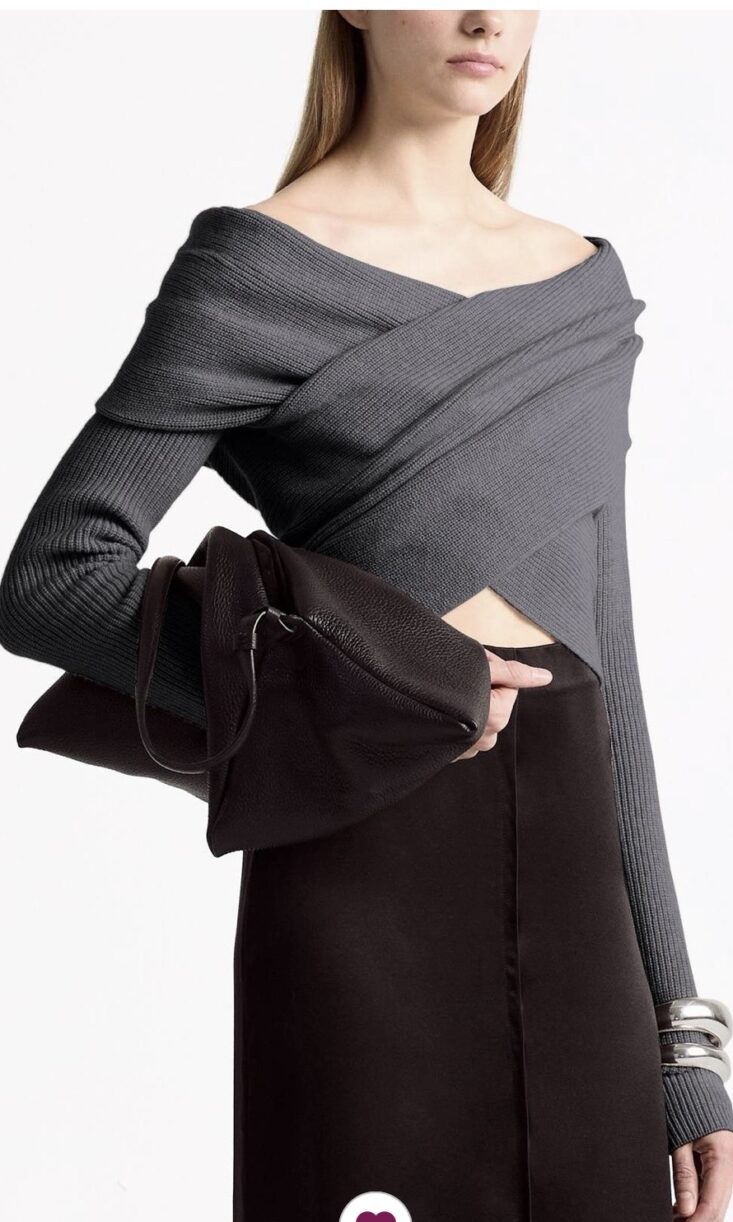 Size and fit: This sweater features an off-the-shoulder neckline, long sleeves, a crisscross front, and a cropped silhouette. It’s made in Italy from a luxe blend of extrafine Merino wool and cashmere, and according to the label, it “fits true to size” with a slim, body-skimming cut. Really? Only if you can get it on.