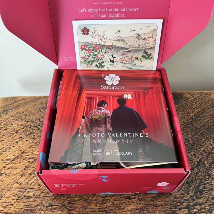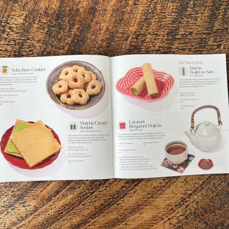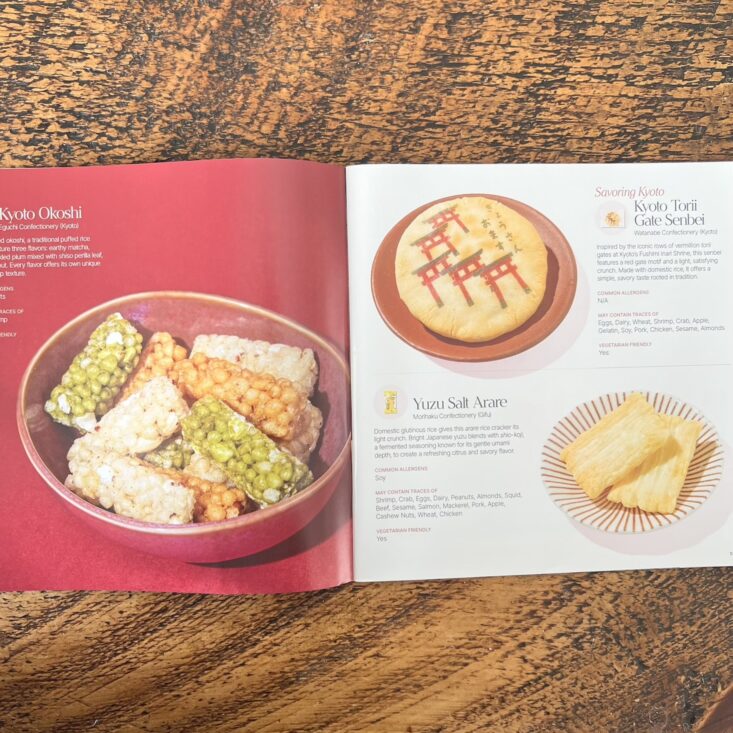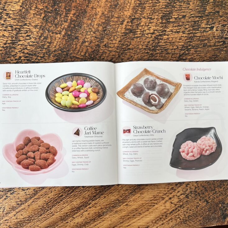 February's box samples a mix of snacks, giving you insight into a Kyoto Valentine's. It was not surprising that Sakuraco included a gorgeous booklet; all of their packaging is so impressive! This booklet describes each snack and lists whether it contains any common allergens.