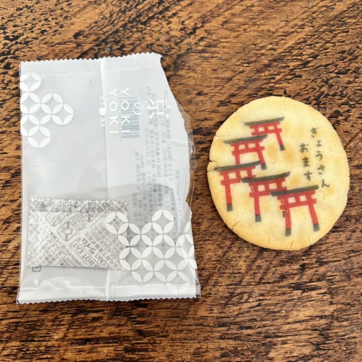 I never wanted to destroy this elaborately decorated senbei by taking a big bite, but once I did, I couldn't stop! It was so delightfully savory, and the red gate motif just added to its allure. The design is inspired by the iconic rows of vermilion torii gates at Kyoto's Fushimi Inari Shrine. This traditional senbei is made from domestic rice, but its fancy-pants design somehow enhanced the flavor.
