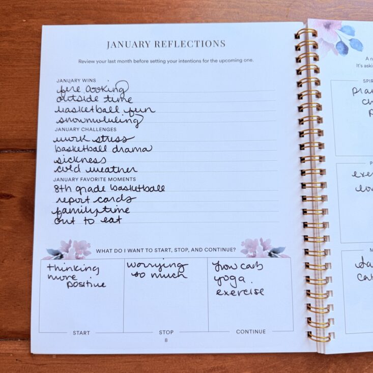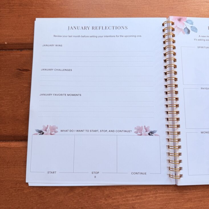 Page 8 offers space to reflect on the previous month, with sections to capture your wins, challenges, and favorite moments. It’s such a helpful way to pause and evaluate what’s working—and what isn’t. This is one of my favorite pages because it reminds me to acknowledge the small accomplishments that might otherwise go unnoticed. There’s also a section to jot down what you want to start, stop, and continue moving forward.