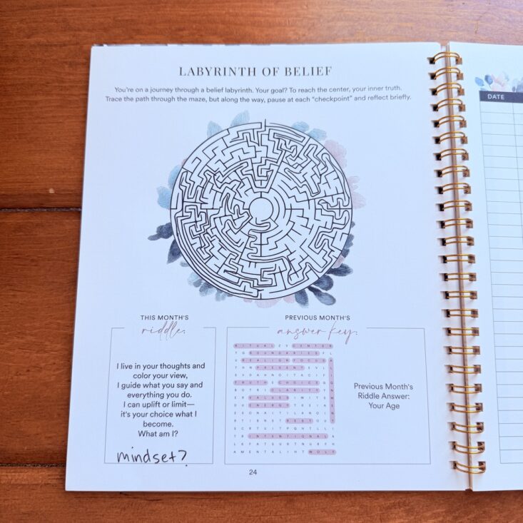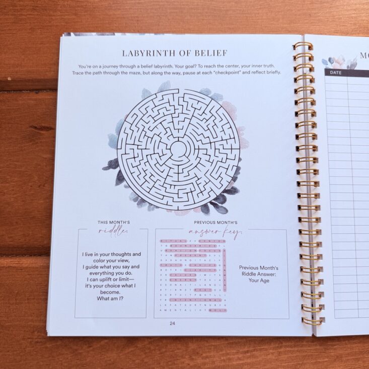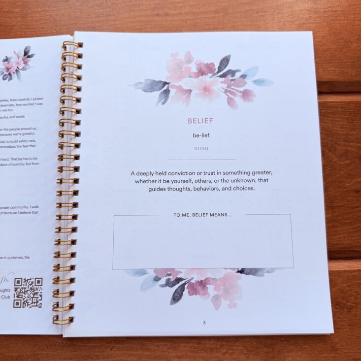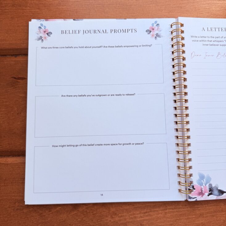This month’s theme is Belief, and the next few pages invite us to reflect on what that truly means in our own lives. On page 14, there are prompts asking us to consider our core beliefs, identify any we may have outgrown, and explore how we might let go of beliefs we’re ready to release. I found these questions a little deep. While I have a few ideas to jot down, I want to really meditate on them before deciding exactly what to write.