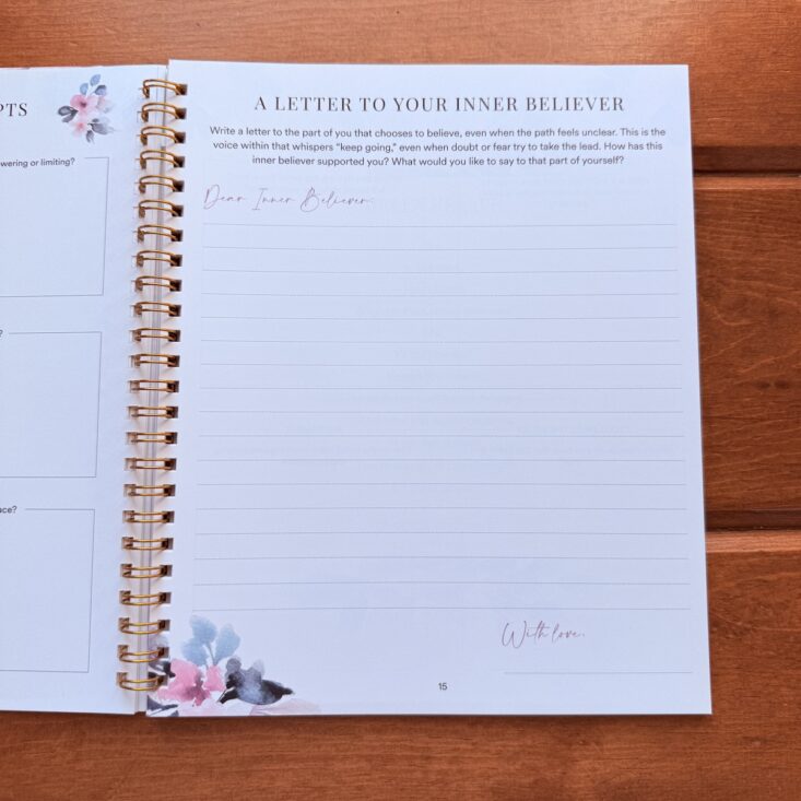 Page 15 offers space to write a letter to your inner believer. I’ve been a little anxious lately and want to clear my head before writing this letter, which is why it’s still blank.
