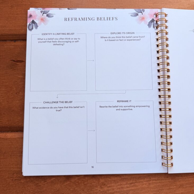 The next activity is another prompt to reframe our beliefs. This page features four sections where you can identify a limiting belief, explore its origin, challenge it, and reframe it. I couldn’t think of one that fit while drinking my morning coffee, so I’ve decided to come back to it daily and reflect.