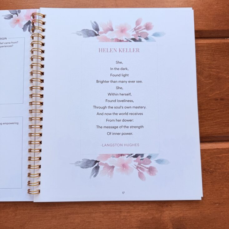 On the opposite page, there’s a lovely poem titled “Helen Keller” by Langston Hughes. It’s beautifully written and offers a powerful sense of belief.