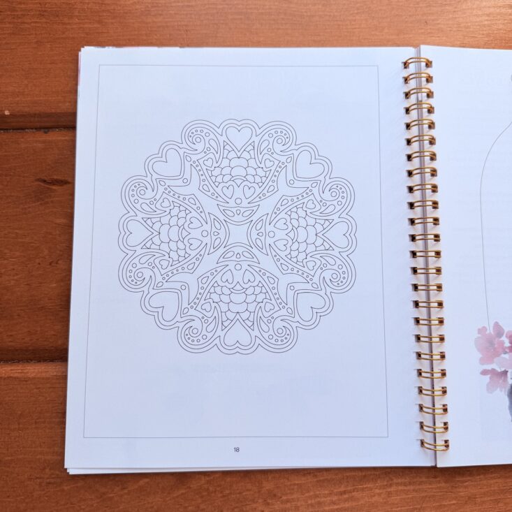 The next page features a really pretty coloring page that I just haven’t had time to work on. Maybe this coming weekend I’ll take out the gel pens and color those little fat hearts—just in time for Valentine’s Day!