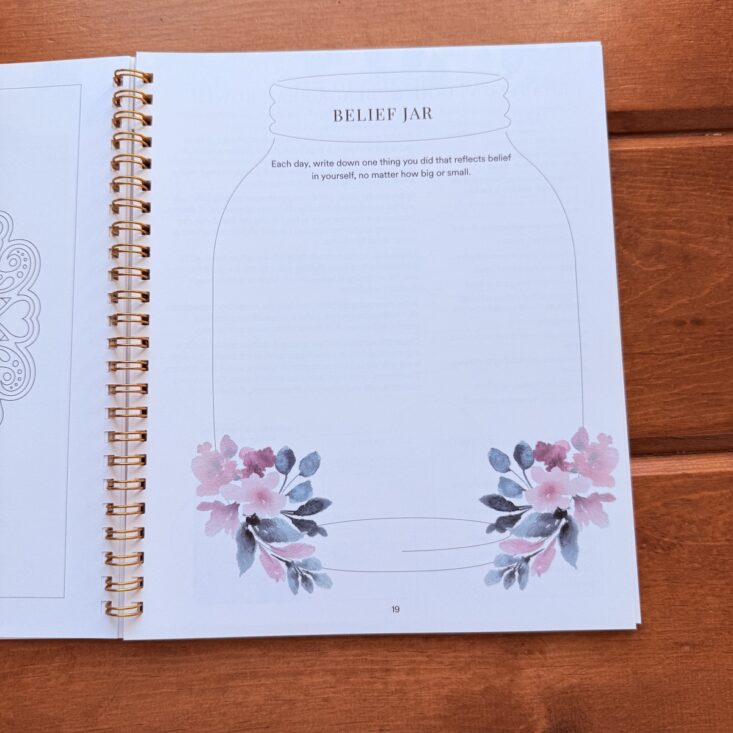 On the opposite page, we’re given a “Belief Jar.” This page asks you to write down one thing you did each day that reflects belief in yourself, no matter how big or small. This is a slightly different activity than we’ve had before, so I’m excited to reflect on it! One of my very favorite things about this journal is watching these jars fill up throughout the month—it’s amazing how much this helps with my mental health.