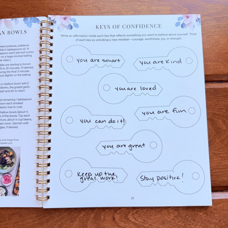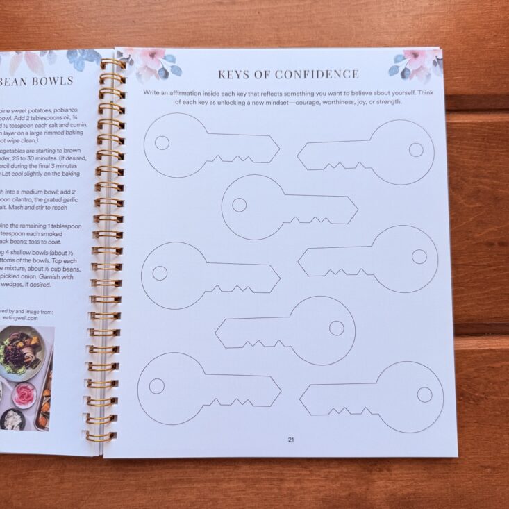 On the opposite page is a “Keys of Confidence” card, which gives space to write an affirmation inside each key that reflects something you want to believe about yourself. This can unlock a new mindset, courage, worthiness, joy, or strength! Plus, it’s just fun to fill in these keys and re-read them throughout the month.