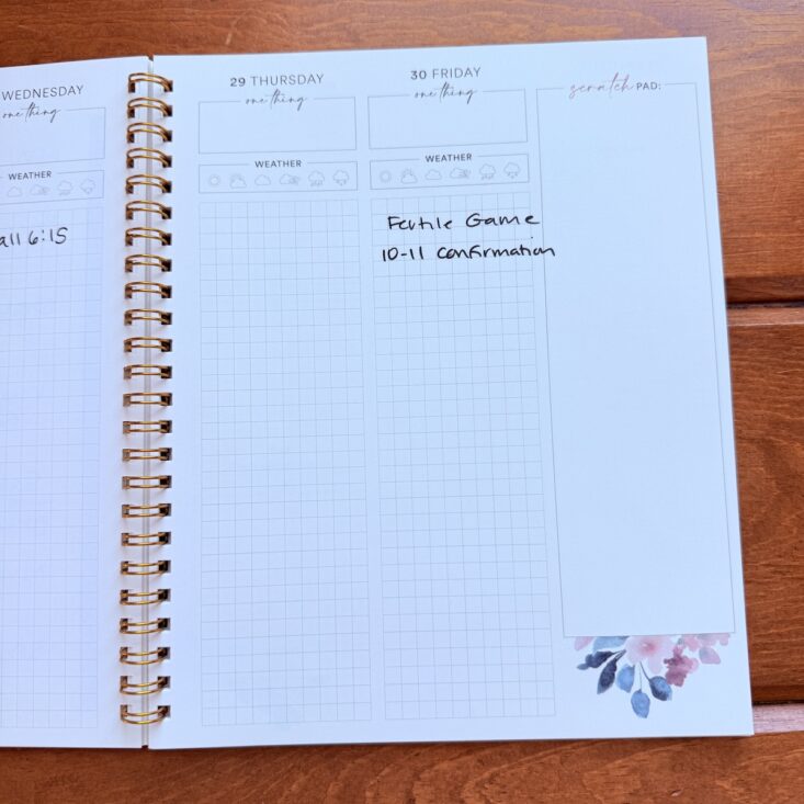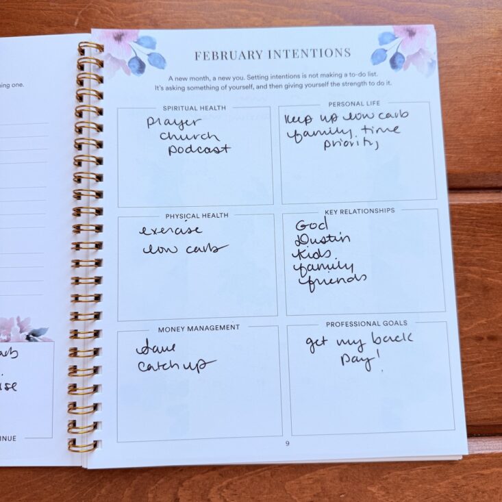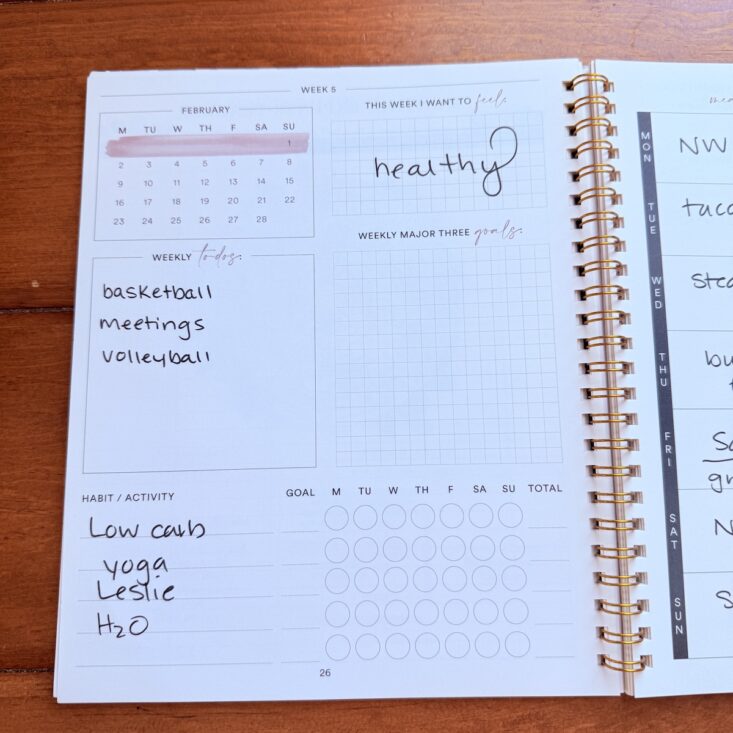 I love that this journal always starts on a Monday, even if that means beginning in the previous month. This month, started on Monday, January 26th so I got a jump start on the month! When it comes to the journal as a whole, I tend to spend most of my time on these calendar pages. With sections for meal plans, to-dos, habits and activities, shopping lists, and daily schedules, I write everything here. It keeps me on track each day and gives me that satisfying feeling of accomplishment—there’s truly nothing better than crossing an item off my list. I also appreciate the extra touches these pages include. While I don’t always fill out how I want to feel each week, this week I found it really helpful to write it down and pray over it. This journal is just so darn helpful!