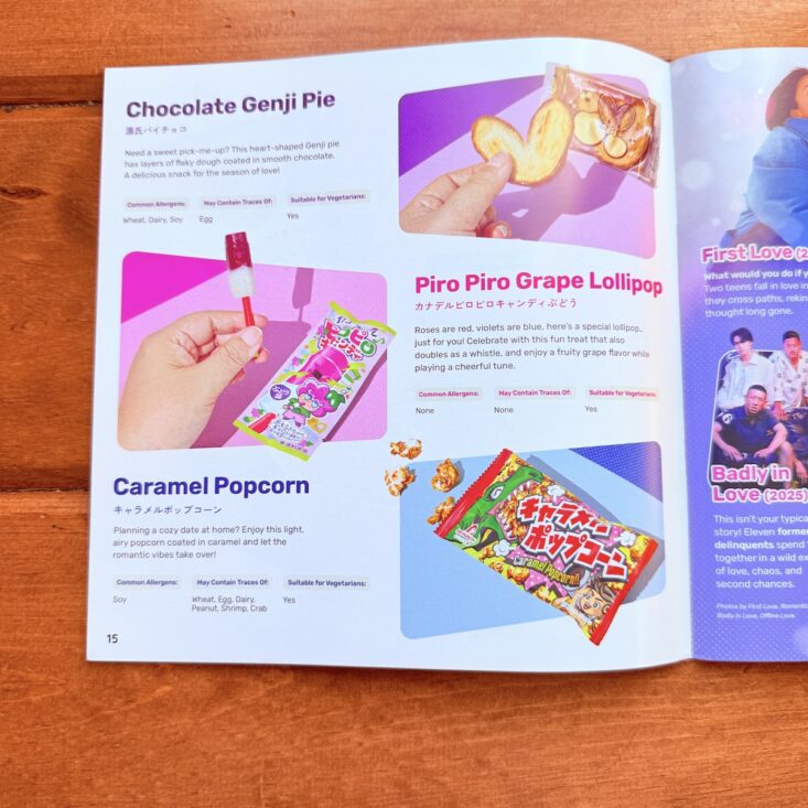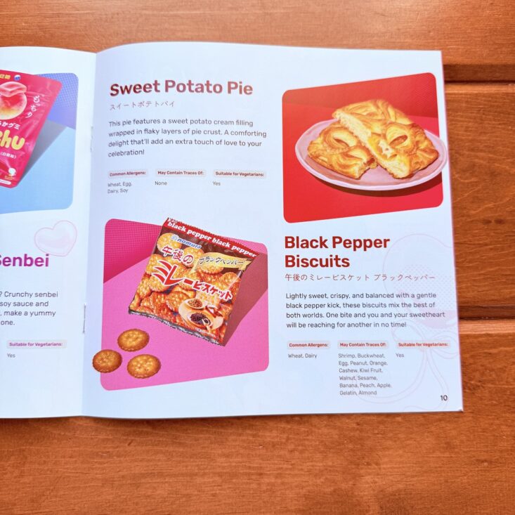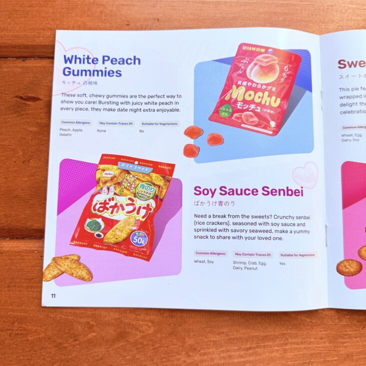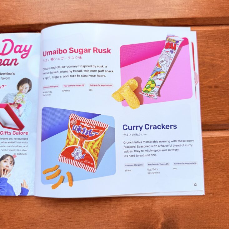 Along with more than a dozen tasty snacks, Tokyo Treat also includes a colorful magazine packed with snack information, cultural information, trivia, facts, and contests! While exact nutritional information isn't shared, (it is on the package, but unless you know how to read Japanese, you're probably out of luck), the pamphlet does include if a food contains a common allergen, what it might contain traces of, and if it is suitable for vegetarians. A great summary of this month's box, my boys loved reading through this guide!