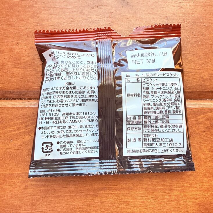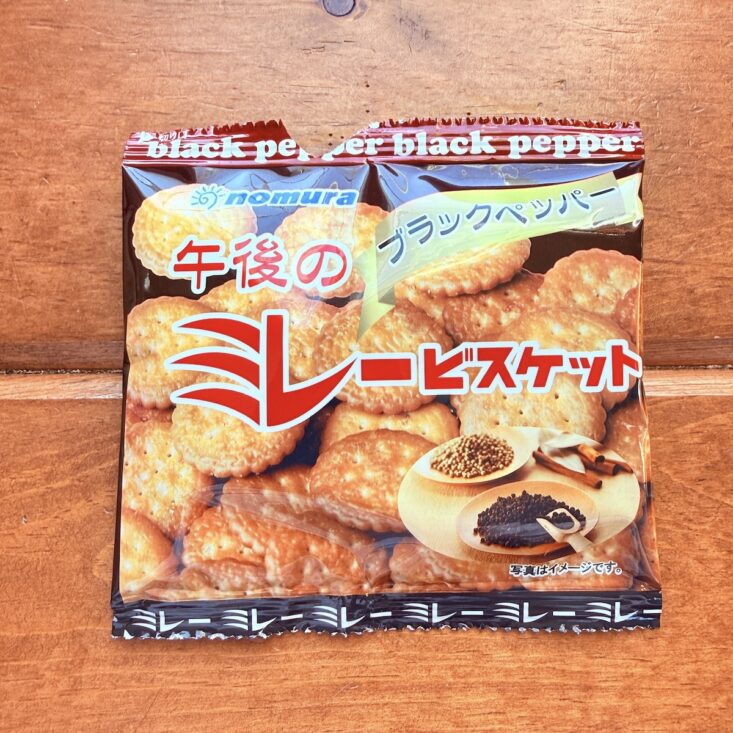 The next snack we received was a small bag of black pepper biscuits. These crackers had a similar shape and texture to a Ritz cracker, but were darker and smaller. Topped with a hint of black pepper, they were a bit spicier than a traditional cracker, yet still tasty in their own way.