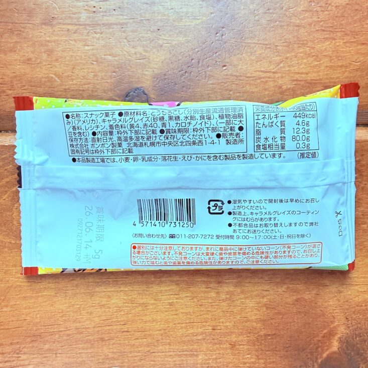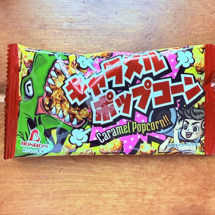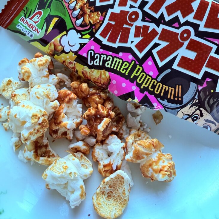 Caramel popcorn is one of my family’s favorite snacks. This little bag featured the Japanese version, and while it was a bit smashed, it was still tasty. Each kernel was coated in caramel and very similar to the versions we enjoy in the U.S.