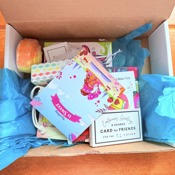 The next item we received was another really neat one. This small hardcover book is actually a continuous greeting card designed for two friends to treasure over the years. The book is split into two sides, giving each friend a dedicated space to write. With six “pages,” there are prompts to share your story, followed by space for your friend to write back.