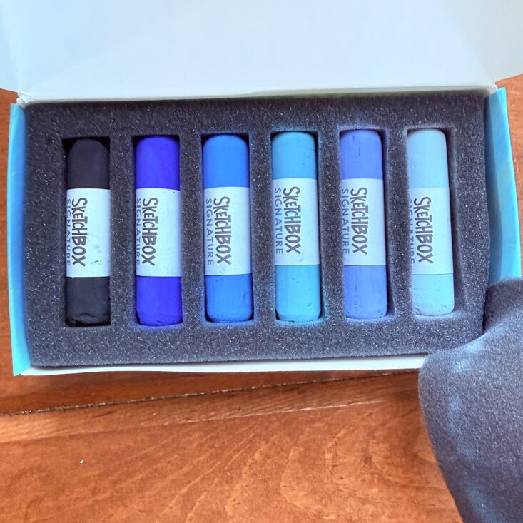 The first item we received this month was a set of soft pastels. The set includes six tones ranging from light blue to black. Gorgeous in color, they’re easy to hold, blend beautifully, and offer a rich, deep pigment. I usually find pastels messy, but this month we also received a tool to help contain the pastel dust (which you’ll see below).