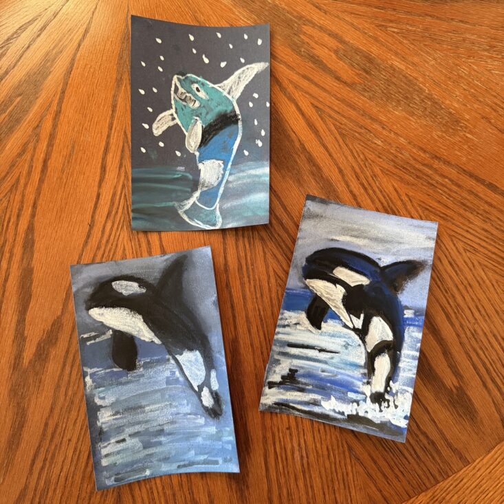 Following the illustrated instructions, the three of us each created our own rendition of Free Willy. My mom was really into art in high school but has since given it up, so this turned out to be a fun and meaningful project for her. As you can see, Charlie went a little rogue with his—and I absolutely love it.