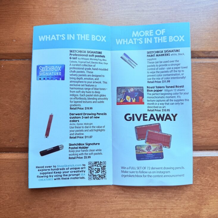 Instead of the traditional postcard, SketchBox has switched to a full pamphlet that showcases the box’s contents. It includes a QR code for SketchBox School—where you can learn how to use the materials—along with extra tips and information on how to enter a giveaway. This month even features a written (and illustrated) tutorial!