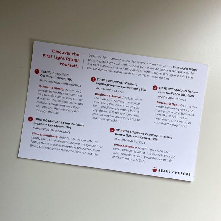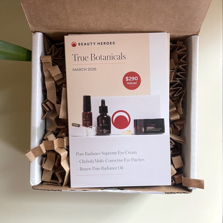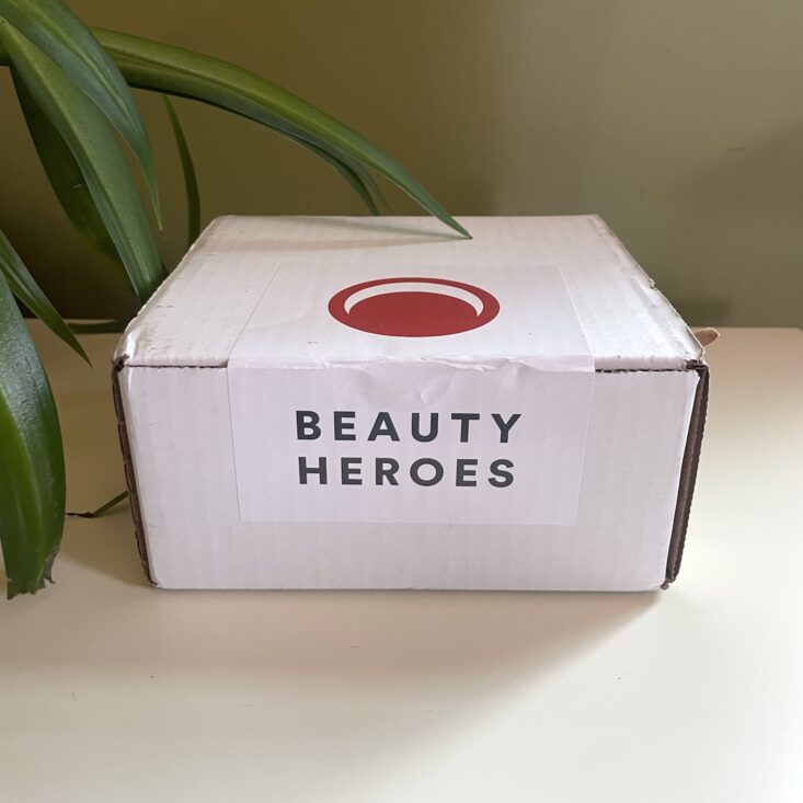 The monthly Beauty Heroes delivery comes in a white box with a red-dotted sticker sealing it. Inside, our products of the month fit perfectly with the brown crinkle paper needed for it to arrive safely.