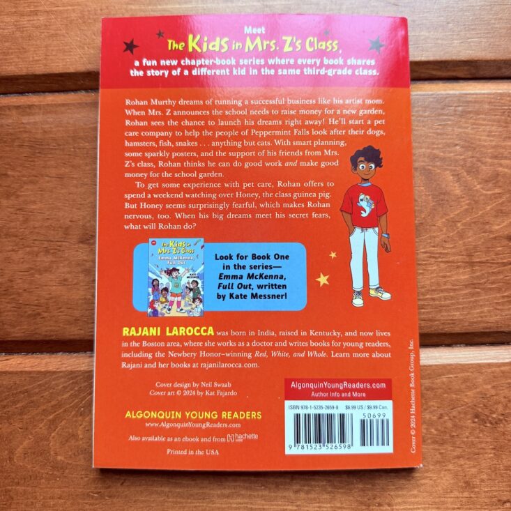 Rohan Murthy dreams of running a successful business—just like his mom, who’s an artist. When Mrs. Z announces that Curiosity Academy needs to raise money for a school garden, Rohan knows it’s the perfect moment to launch his dreams! He'll start a pet care company to help the people of Peppermint Falls look after their dogs, hamsters, fish, snakes, lizards . . . anything but cats. With hard work, some glittery posters, and the help of his friends from Mrs. Z's class, Rohan knows he can do a lot for the school garden. His parents point out just one small problem: Rohan has never taken care of an animal before. Gulp! To get some experience with pets, Rohan volunteers to spend a weekend watching over Honey, the class guinea pig. But Honey appears surprisingly fearful, which makes Rohan nervous too! When his big dreams meet his secret fears, what will Rohan decide? Both sweetly poignant and laugh-out-loud funny, with black-and-white illustrations by Pura Belpré Honor artist Kat Fajardo, Rohan’s story invites readers into Mrs. Z’s class where friendship and fun rule the school, from Newbery Honor-winning author Rajani LaRocca.