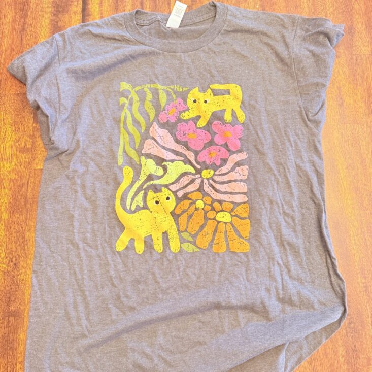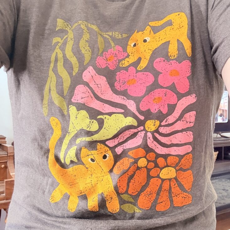 The first item we received this month was an adorable T-shirt featuring an abstract design and bright, cheerful colors. With multi-colored florals and playful orange kitties, it’s the perfect way to welcome spring! Printed on a soft heather gray tee, the contrast really makes the design stand out, and the fabric feels incredibly comfortable. It pairs effortlessly with leggings or jeans, adding a fun pop of personality to any casual outfit. I’ve already found myself reaching for it multiple times—it’s definitely a new favorite in my wardrobe!