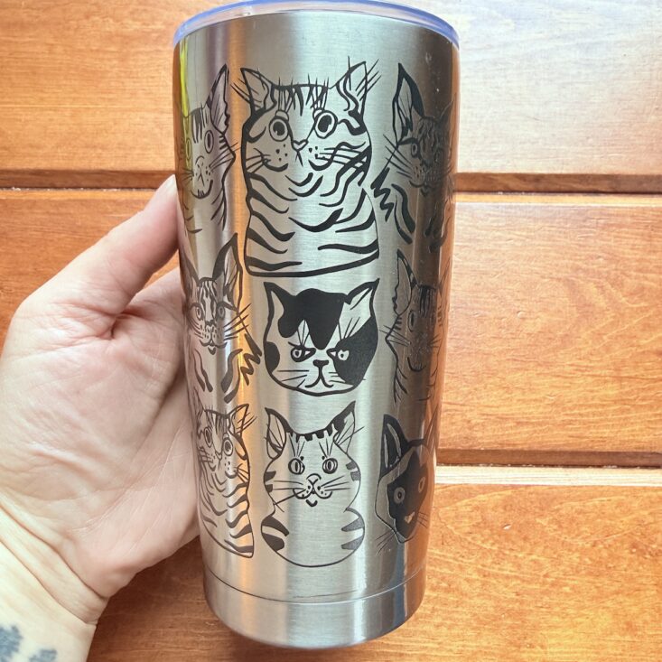 The next item we received was an extremely useful one! I drink a lot of coffee in the mornings, and while I already have a few tumblers lying around, I can always use another. This stainless steel tumbler features a variety of kitties laser-etched into the surface, creating a fun design that shows off my love for cats. Looking at all the different faces, I’m pretty sure I’ve had almost every cat featured at one point or another!