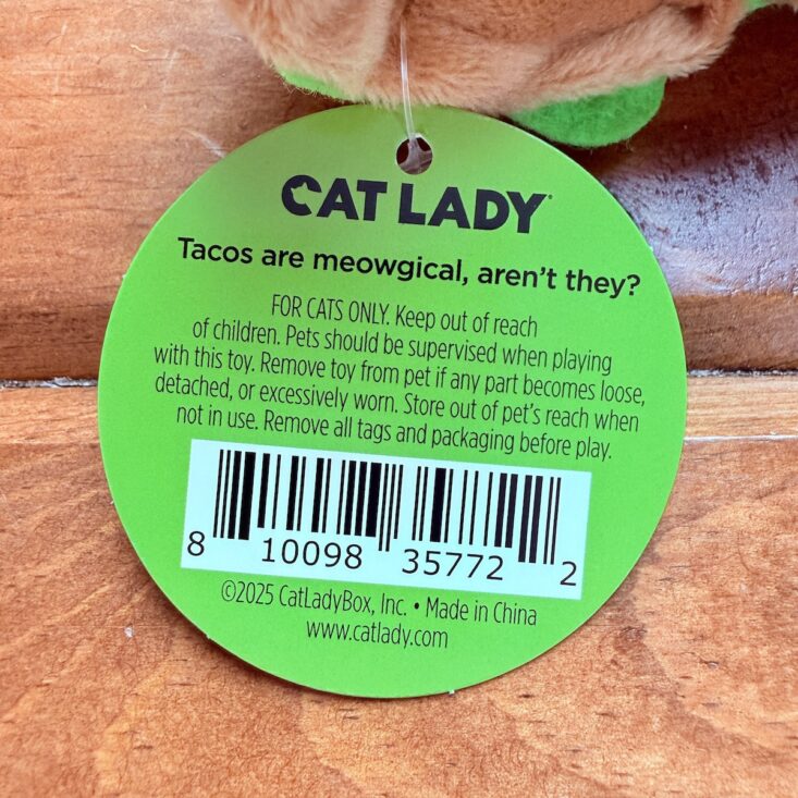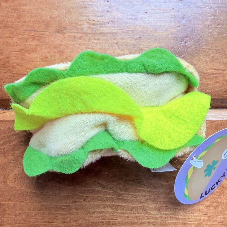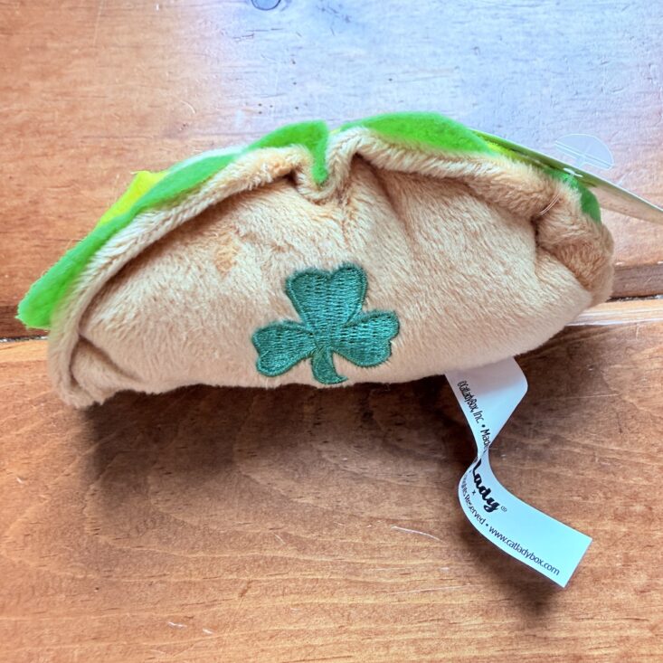 The next toy we received offered a nod to St. Patrick's Day. This little taco is filled with goodies and has an embroidered clover on the shell. Adorable in design, this is stuffed with catnip and smells ultra good!
