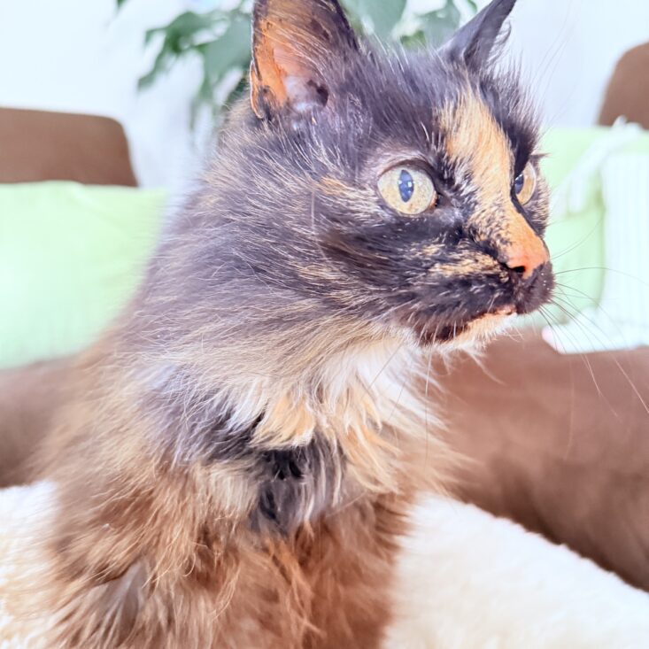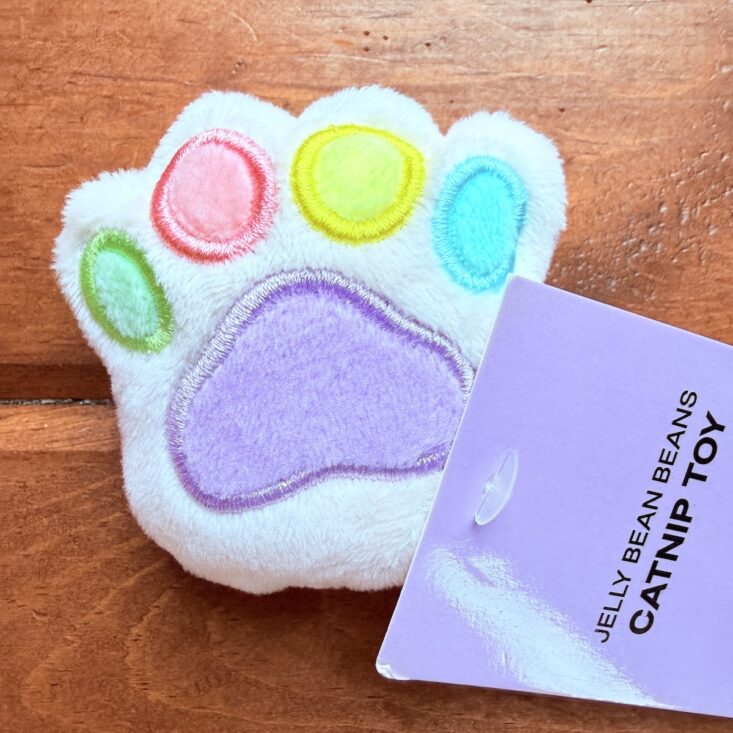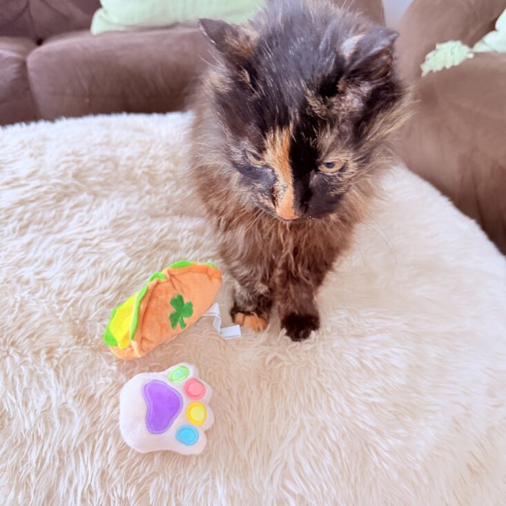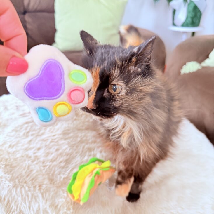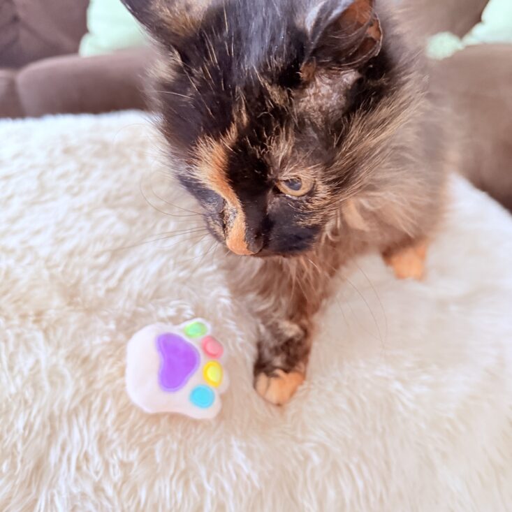 This subscription seriously has the cutest toys ever. The next inclusion was a little pastel paw. Soft and fluffy, it was absolutely adorable. Miley didn’t seem to appreciate him as much as I did at first, but she eventually cuddled up next to him after I placed him in her bed.