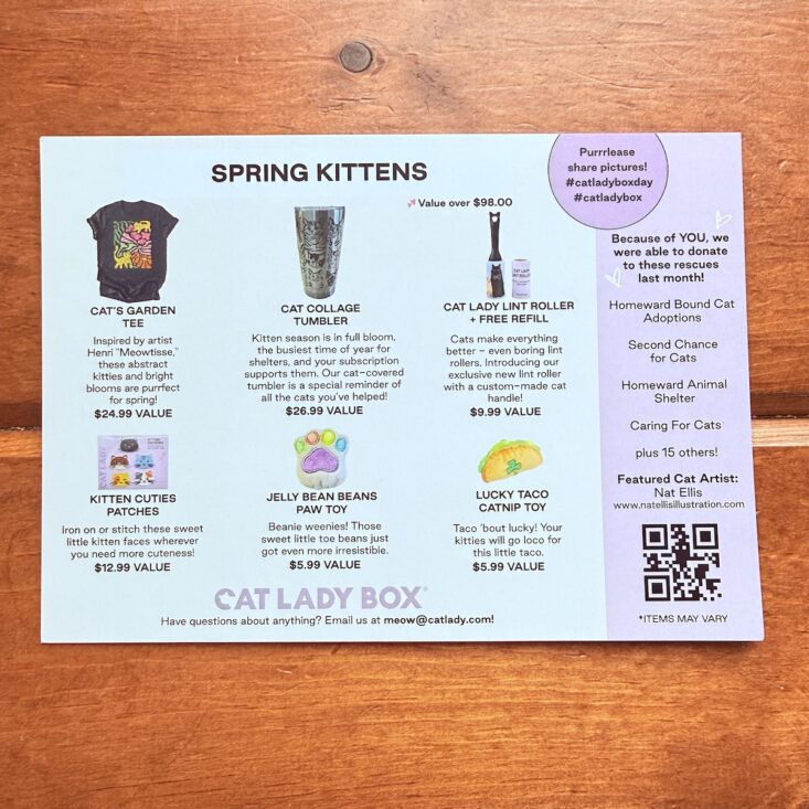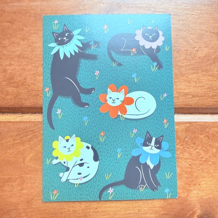 Along with the items, this box also included an info sheet—and guess what? The custom artwork is back! This month’s design is bright and cheery, perfect for a springtime box. Created by Nat Ellis, the card features illustrated kitty flowers in green grass. It’s cute, seasonal, and definitely gets me in the mood for warmer temperatures!