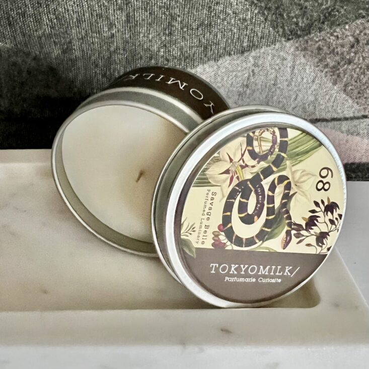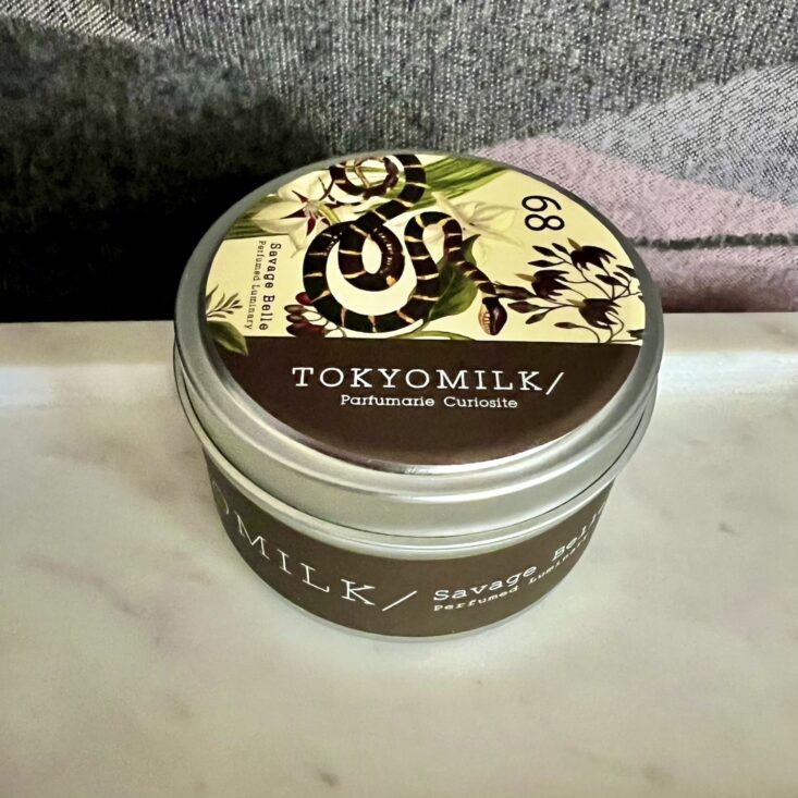I am not your average fragrance connoisseur; I seek out fragrances that thrill me and brands that make me feel a little dangerous when I wear them. When I was fresh out of college, still finding myself (much like today!), my sister gifted me with a bottle of Tainted Love by TokyoMilk, and my world? Totally rocked. I never realized how transcendent fragrance could be, and I've always looked to TokyoMilk as the GOAT at blending complex notes into irresistible, addictive fragrances. Savage Belle is one of those scents that is soft with a dark side. Notes of ginger mingle with lovely wisteria, and charcoal accord adds a smoky, mysterious undertone. This tin candle scented my living room within 20 minutes of burning, and my husband even commented on the "alluring" scent when he walked in.