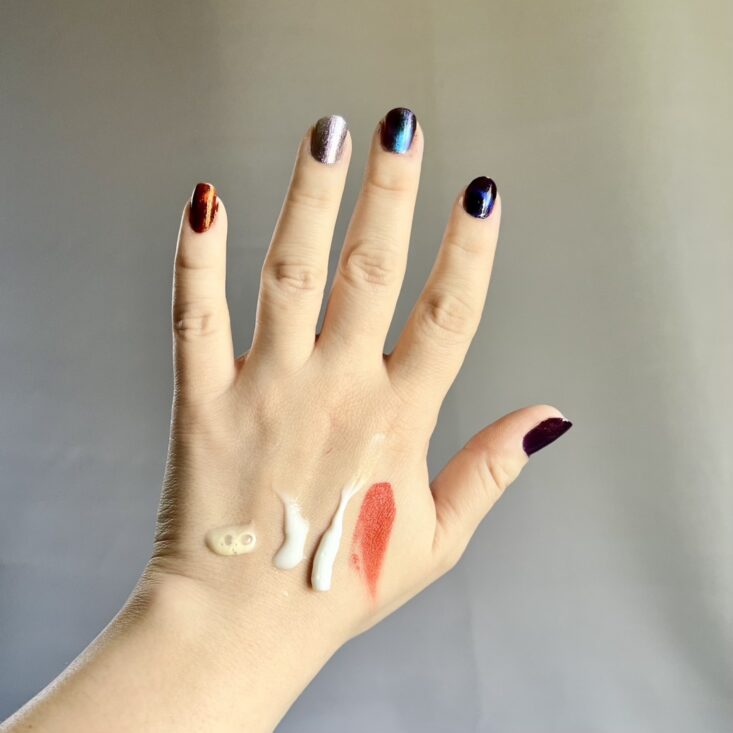 Swatched above: Smood Serum, Trifle Cosmetics Buttercream, Solaana MD's Healthy Base Layer, Nourish Naturals Vegan Stain
