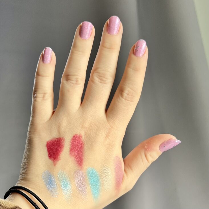 Swatched above: Lord & Berry lipstick, Kaleido Cloud Cream, Jelly Pong Pong Hummingbird Palette