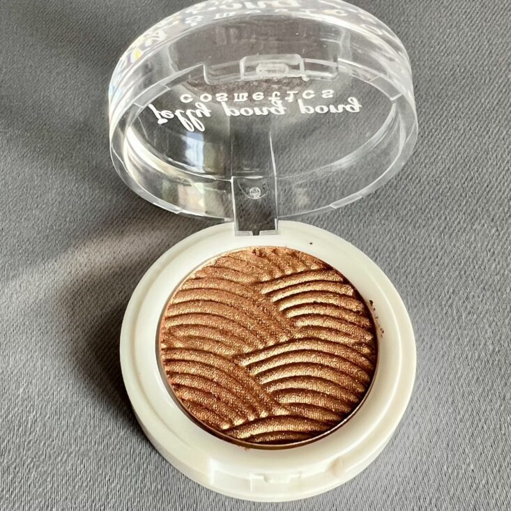 Jelly Pong Pong describes the formula as an "intensely foiled spongy eyeshadow," and they are right on the money. I've had the most success applying this type of shadow with my fingertips. You can apply a very sheer wash of color or build it up to the shade you see in the pan. It is a gorg rose gold, perfect for a metallic pop of color or all-over-the-lid shade.