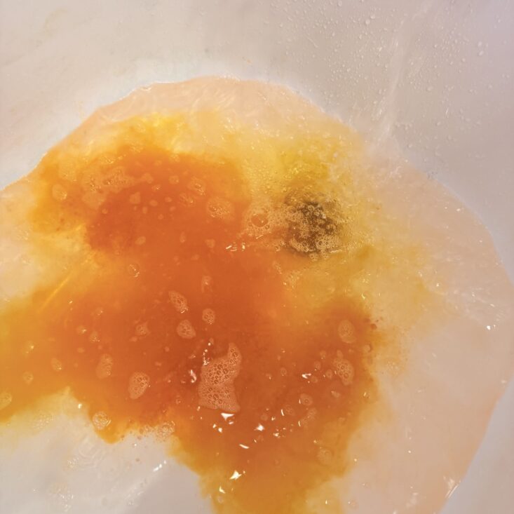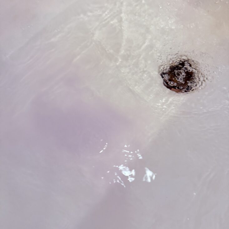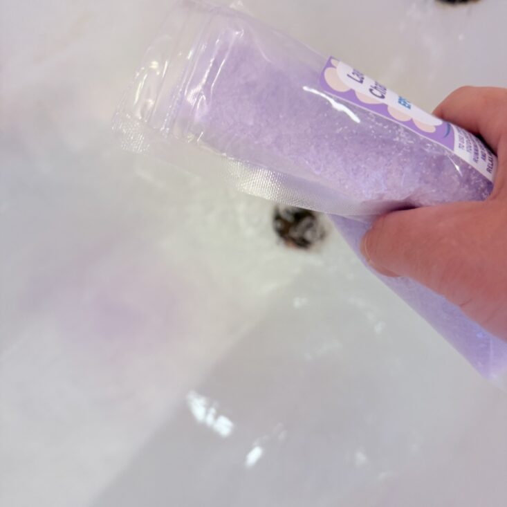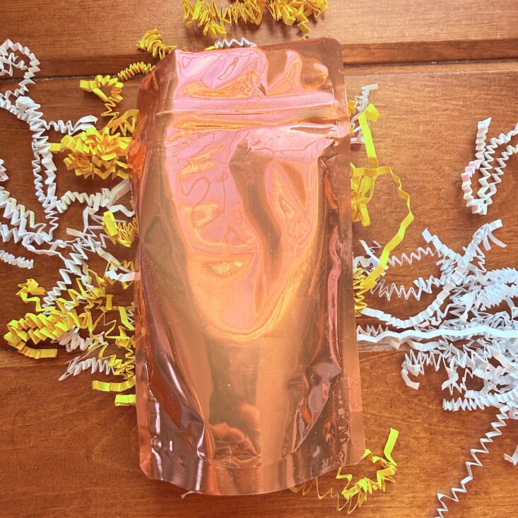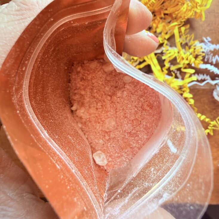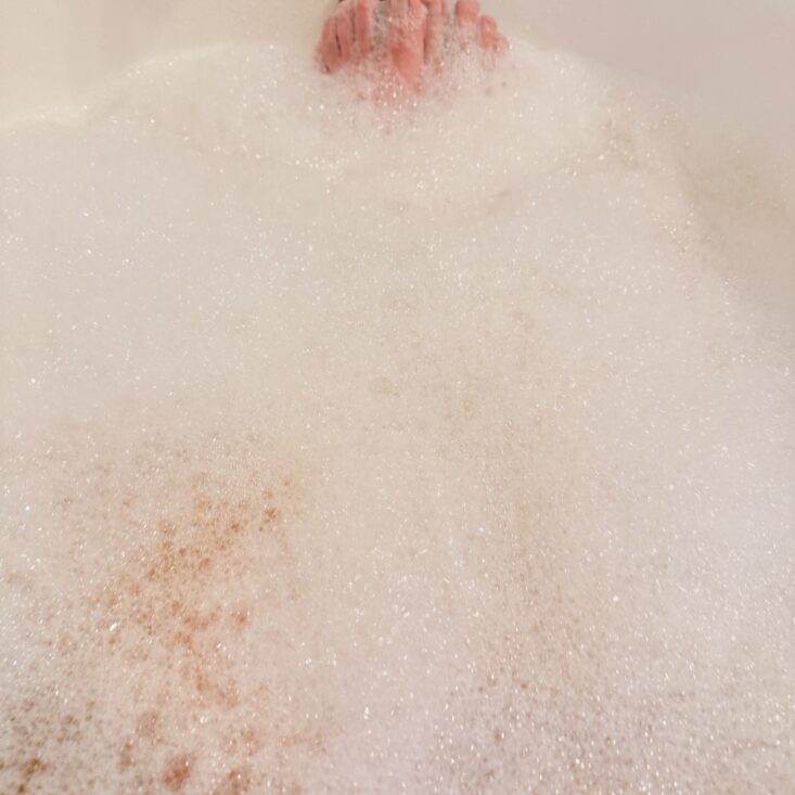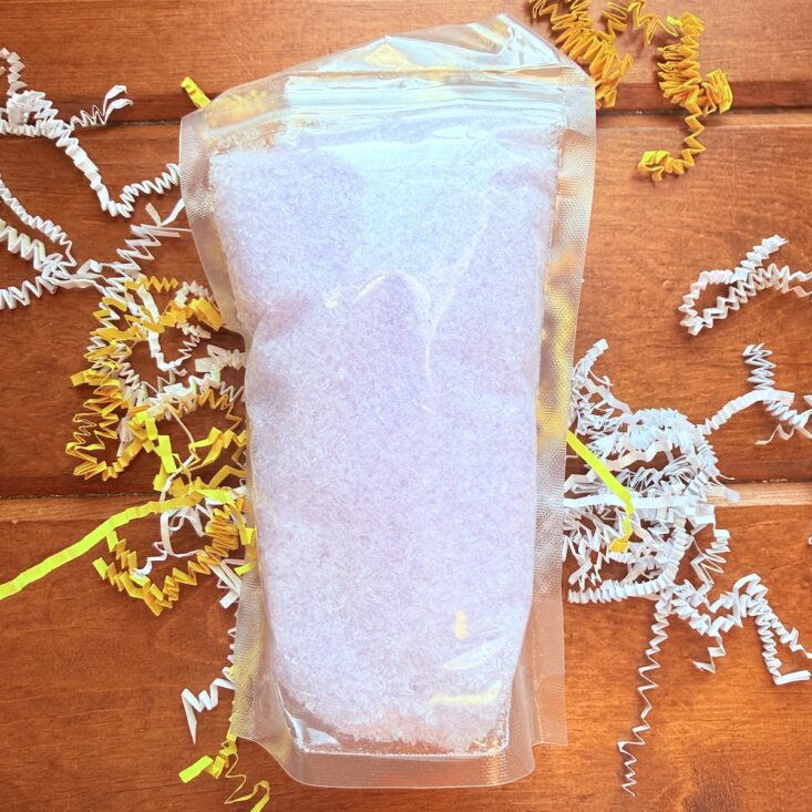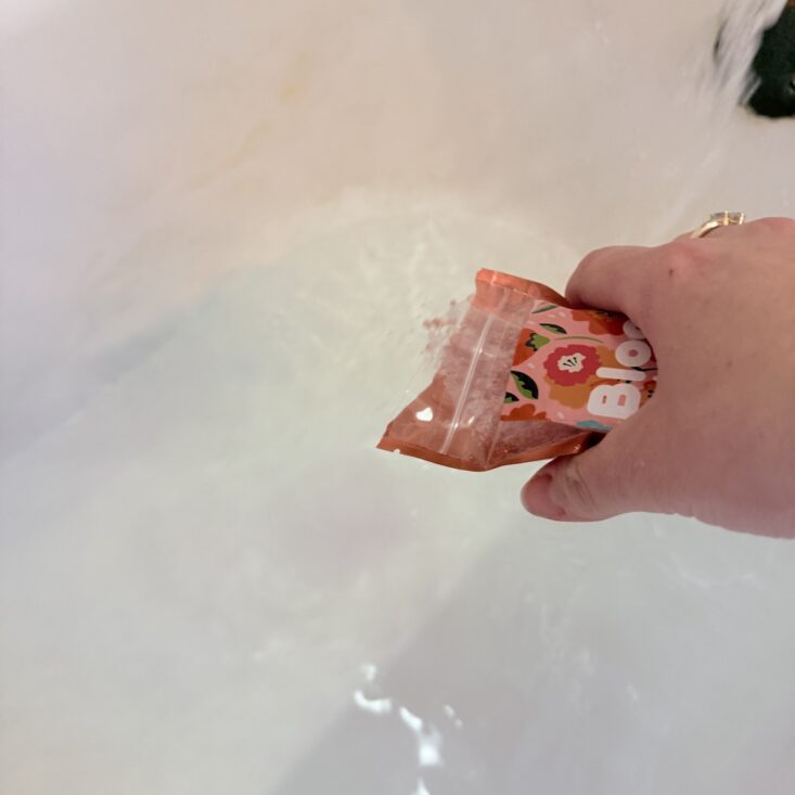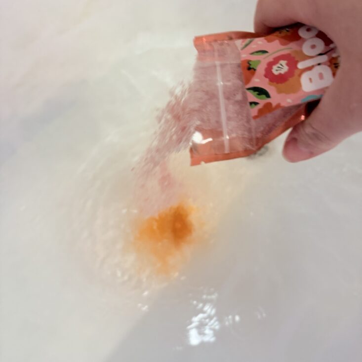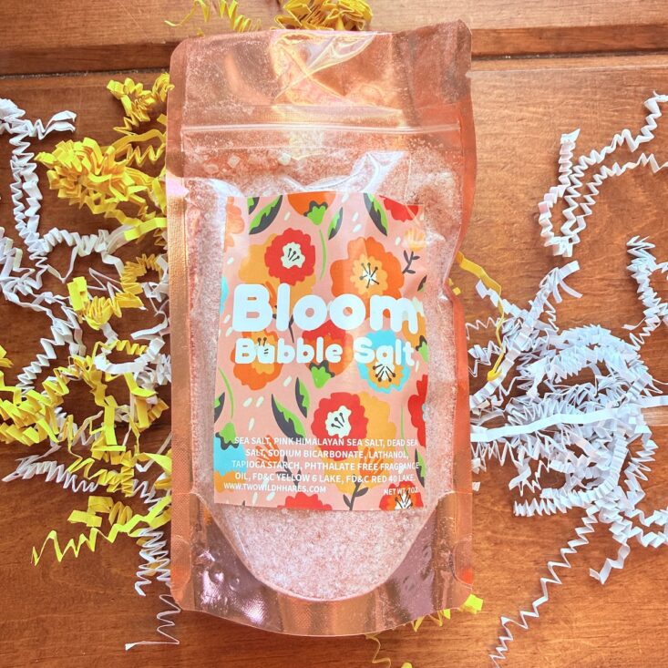 This month, we also received a large bag of a salt and bubble combo. This powder pours into hot water, creating a beautiful orange hue before forming soft, luscious white bubbles. It has a lovely floral scent that’s perfect for a “Hello Spring” theme and definitely made my day a little brighter.