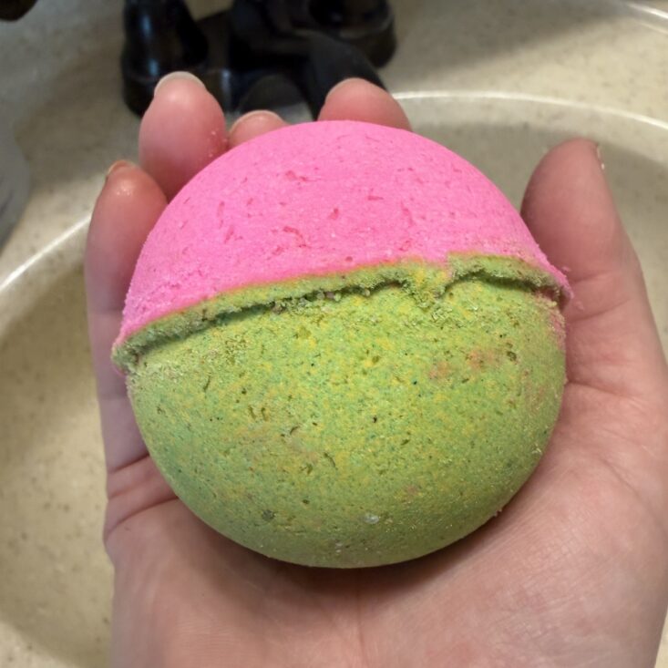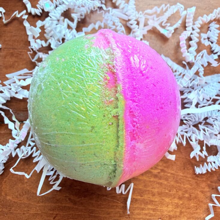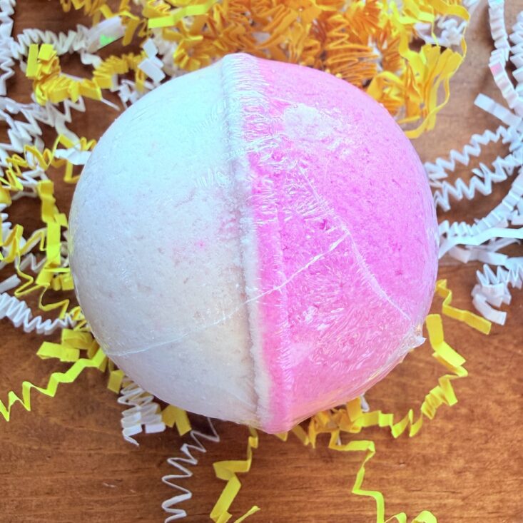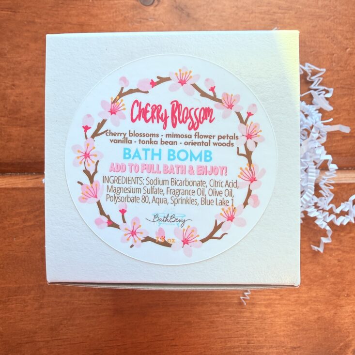 Bath bombs are definitely our favorite items to receive in the Bath Bevy box. This month’s first one is “Cherry Blossom,” and it’s gorgeous in color. It’s scented with pink Japanese cherry blossoms and fragrant mimosa flower petals, with notes of vanilla, tonka bean, and oriental woods.