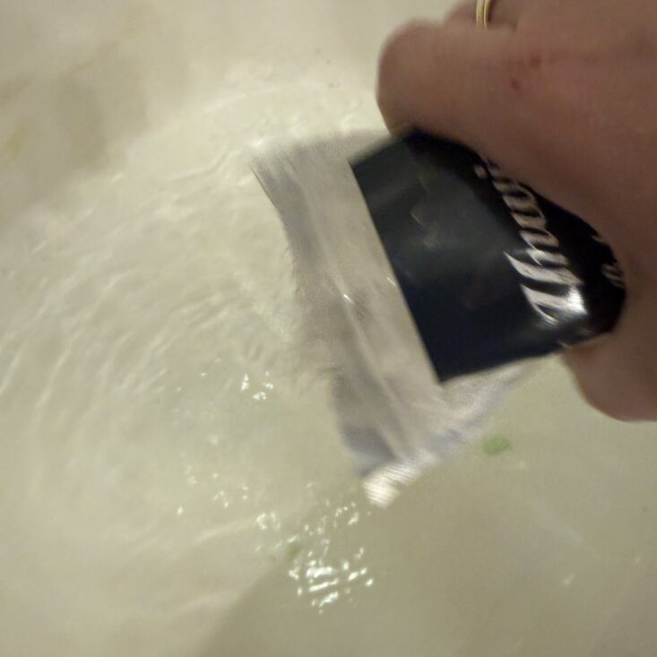 Charlie asked if he could have this bath bomb, so I’ve saved it for him and don’t have photos of it in use yet—but I’ll keep you posted after he soaks in it! In general, these bath bombs are beautiful, smell great, and create a lovely bath color without staining.