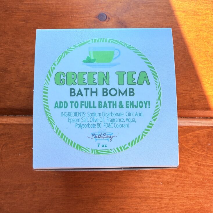 Bath bombs are definitely our favorite items to receive in the Bath Bevy box. The first one we received this month was green and white and, as always, jumbo-sized! Green tea is a new fragrance for us, and it has a slightly earthy, floral scent. In the packaging, it isn’t overpowering, and the pretty muted tones are relaxing just to look at.
